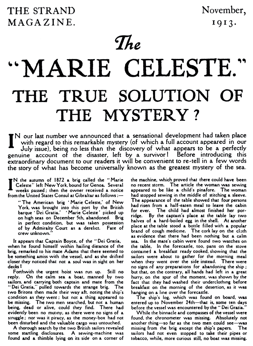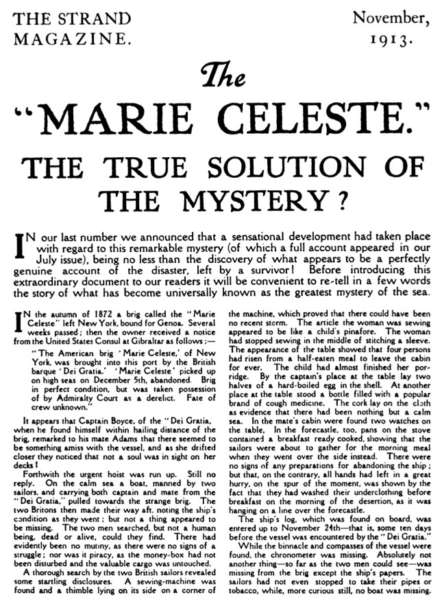 (Théodore de Wyzewa, in Le Temps, cinquante-troisième année, n° 19113, dimanche 2 novembre 1913 ; les illustrations sont extraites de l’article « The Mary Celeste: The True Solution of the Mystery? » du Strand Magazine de novembre 1913)