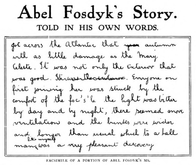 J’ai insisté à dessein sur cette lettre d’envoi, car le fait est que la personnalité de son auteur constitue pour nous l’un des éléments principaux d’un problème « psychologique » dont je serais tenté de dire qu’il a remplacé désormais l’ancien mystère « historique » de la Marie-Céleste. Si seulement Abel Fosdyk a vécu, s’il a figuré parmi les serviteurs de M. Howard Linford et lui a légué en mourant trois caisses de papiers, nous pouvons être à peu près sûrs de posséder dorénavant l’explication définitive de l’aventure de la goélette. Le manuscrit envoyé au Strand Magazine, et dont un fragment se trouve reproduit en fac-similé, nous présente toutes les apparences d’une relation parfaitement naturelle et sincère. Son style même, avec son mélange d’emphase et de gaucherie, n’a rien qui démente l’hypothèse d’un vieux domestique écrivailleur et tout bourré de lectures. Ou bien nous avons là, en effet, le récit véridique d’un survivant de la Marie-Céleste, ou bien ce récit et le brave homme qui l’aurait rédigé ont été inventés de toutes pièces par un adroit mystificateur.