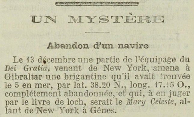 De Gibraltar, ce 2 janvier 1873. – La Goélette américaine MARIE-CÉLESTE de New-York, vient d’être amenée dans notre port par une barque anglaise, le DEI GRACIA. Marie-Céleste fut rencontrée en plein Océan, le 5 décembre, dans un état absolument parfait, mais sans personne à son bord. Impossible de rien savoir du sort de son équipage. – (Les journaux.)
