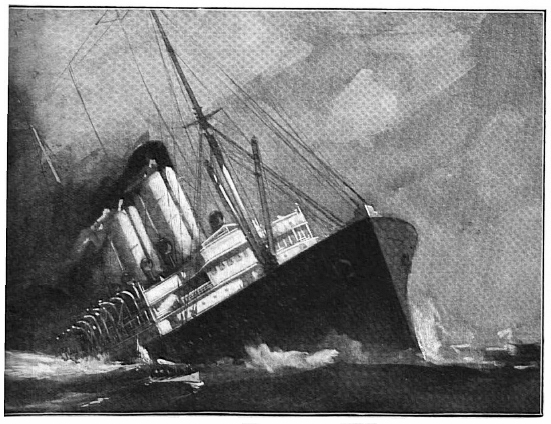 (Charles de Révigny, in La Revue, vingt-cinquième année, n° 15, 1er août 1914 ; la nouvelle de Conan Doyle : « Danger! Being the Log of Captain John Sirius, » est parue dans le numéro du Strand Magazine de juillet 1914, illustrée par Edward S. Hodgson, avant d’être reprise en deux livraisons dans le Collier’s Weekly du 22 et 29 août, avec des illustrations de Henry Reuterdahl ; les gravures sont extraites de la publication originale du Strand Magazine)
