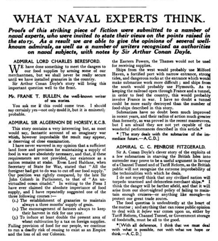 – L’amiral Sir Compton Domville, K. C. B., est d’avis que la nouvelle de Sir Conan Doyle est une œuvre à la Jules Verne, représentant les éventualités de l’avenir. Dans le présent, aucun sous-marin ne pourrait tenir la mer assez longtemps pour faire une campagne navale aussi effective.