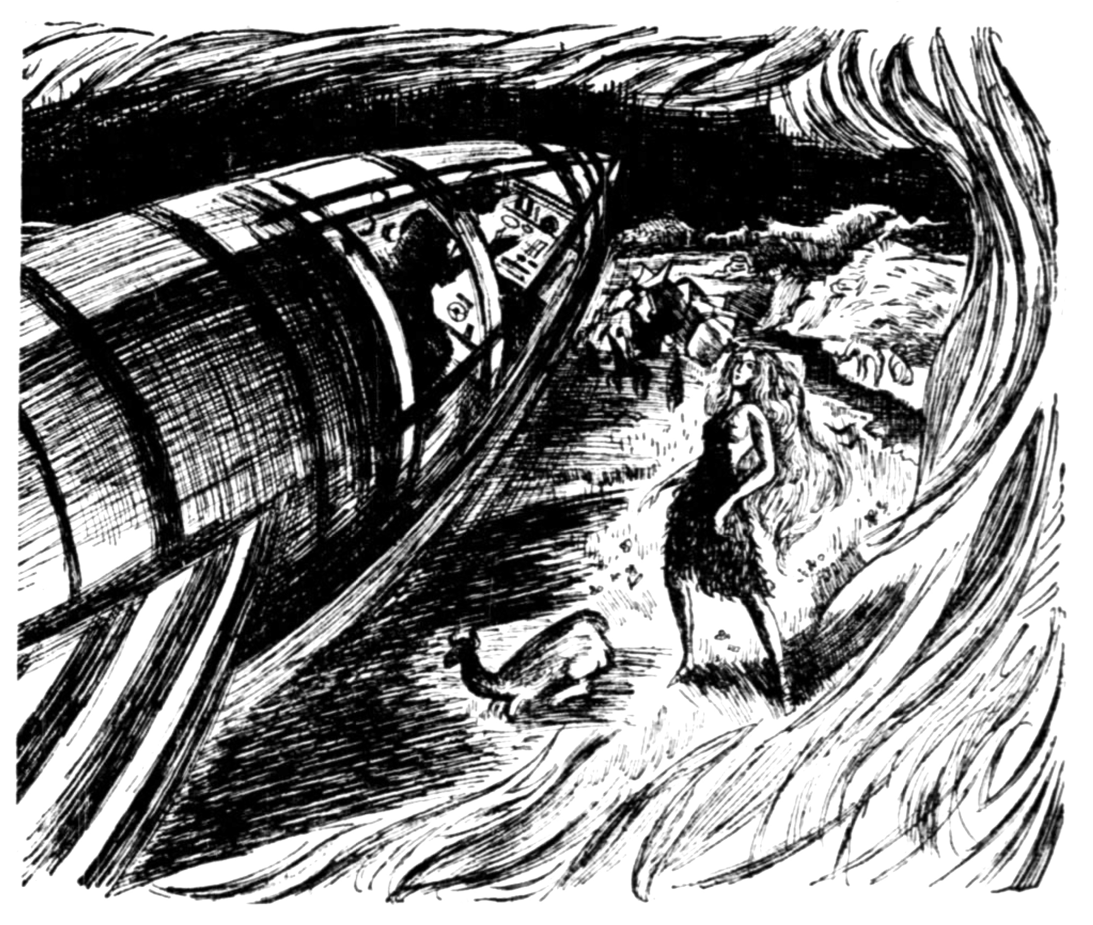 Inutile d’essayer d’obtenir une explication ; aussi je saisis les lianes qui poussaient sur les ruines et me hissai dessus. Prenant la main de la jeune fille, je l’attirai vers moi. Le contact me fit frissonner. Quelle beauté merveilleuse ! Ses bras nus et sa tenue rustique lui donnaient un aspect original. Elle sauta sur la ruine comme une fée, les yeux brillants, tout son corps vibrant. Elle me dépassa d’un bond et, écartant les herbes folles, découvrit la porte de l’avion. Je trouvai à l’intérieur exactement ce que j’attendais : des moteurs atomiques démolis et des instruments tordus. Ces épaves dénotaient une civilisation pour le moins égale à la mienne. Dans cette cabine calcinée et en partie arrachée, je lus la tragique histoire commencée ici même, dont le dénouement se jouait là-bas, dans la maison à l’ombre des arbres-fougères. Quelle avait dû être leur existence dans cette comète ! Sans espoir, ce père voyait venir sa fin prochaine ; sa fille restait seule et sans protection.