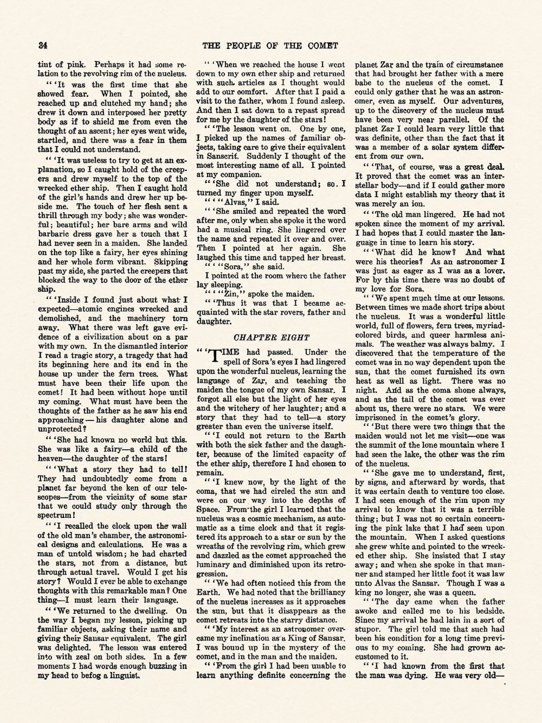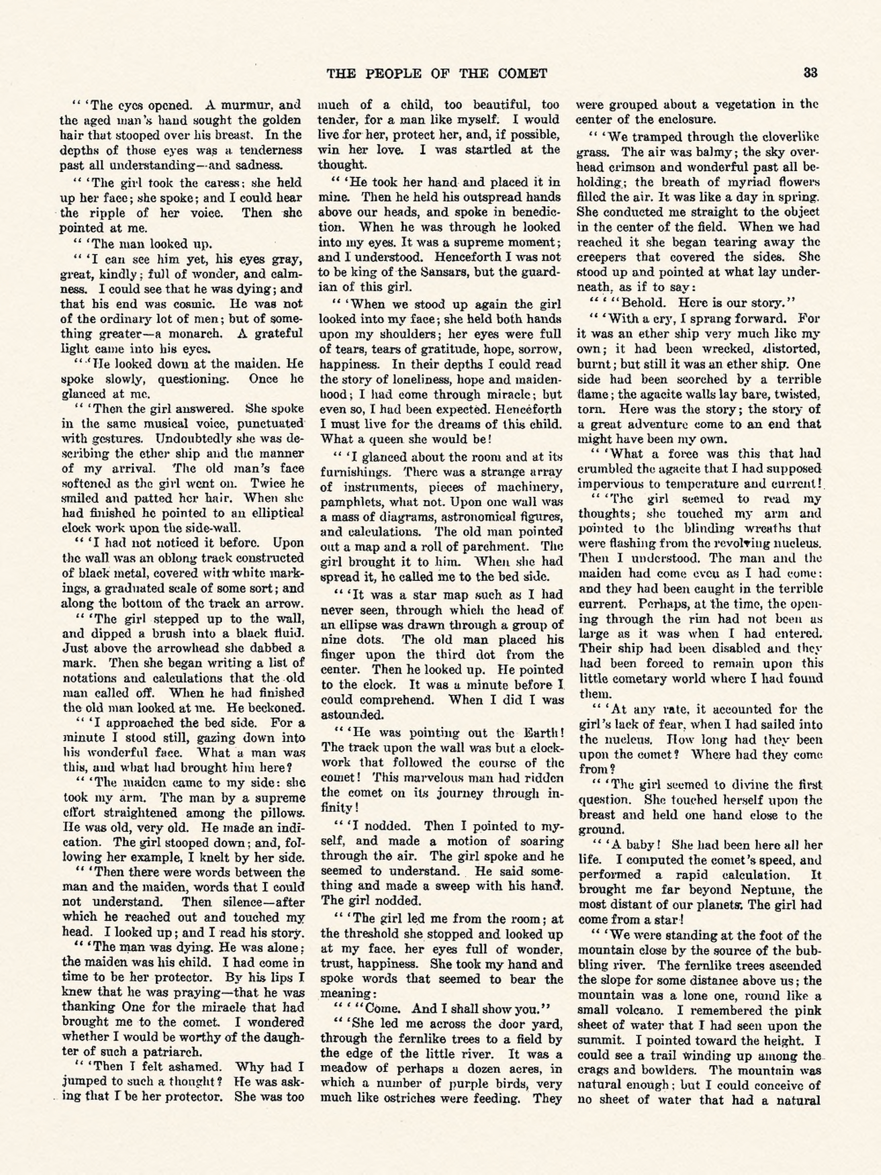 Moi, l’explorateur, parti de la planète Terre pour visiter une comète ; elle, une jeune fille, la plus belle qui se soit jamais présentée à mes yeux éblouis. Ses grands yeux bleus pleins d’innocence me regardèrent avec un profond intérêt ; toute son expression dénotait l’espoir, l’étonnement, l’ardeur. Protégeant son front de la clarté trop vive, elle regarda à l’intérieur et me fit des signes. Je ne comprenais pas l’expression de son regard.