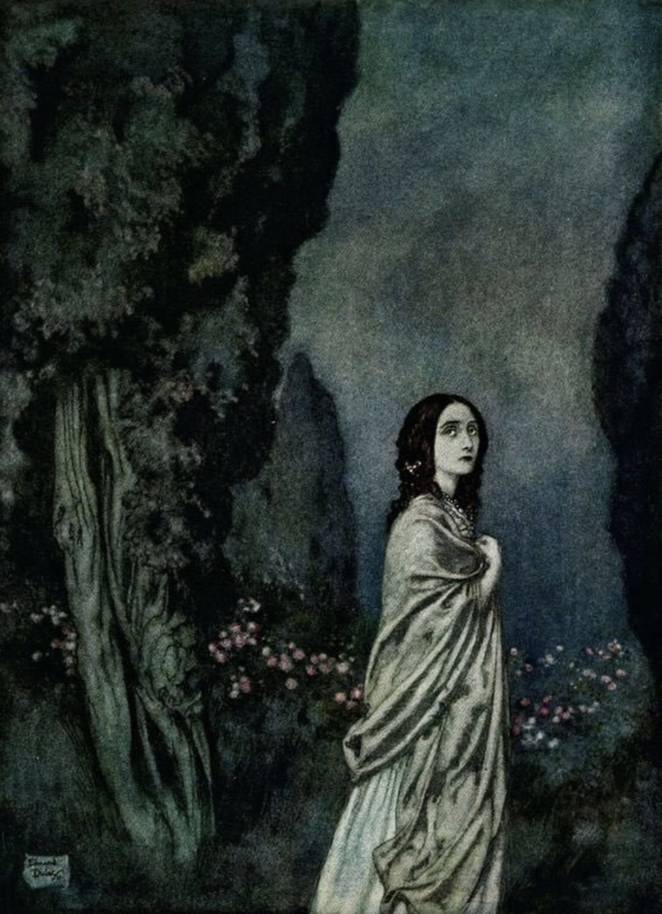 (« Érasme, » « Variétés, » in Les Variétés, journal quotidien, indépendant, dix-septième année, n° 270, 23 septembre 1897 ; « Érasme, » « Variétés, » in Le Palais Royal, journal quotidien, indépendant, dix-septième année, n° 268, 25 septembre 1897 ; anonyme, « Causerie, » in Le Petit Caporal, organe quotidien de l’appel au peuple, vingt-deuxième année, n° 266, dimanche 26 septembre 1897 ; « Érasme, » in Gil Blas illustré hebdomadaire, neuvième année, n° 7, 17 février 1899. « And thou, a ghost, amid the entombing trees, » illustration d’Edmond Dulac pour The Bells ans Other Poems d’Edgar Allan Poe, London: Hodder & Stoughton, 1912)