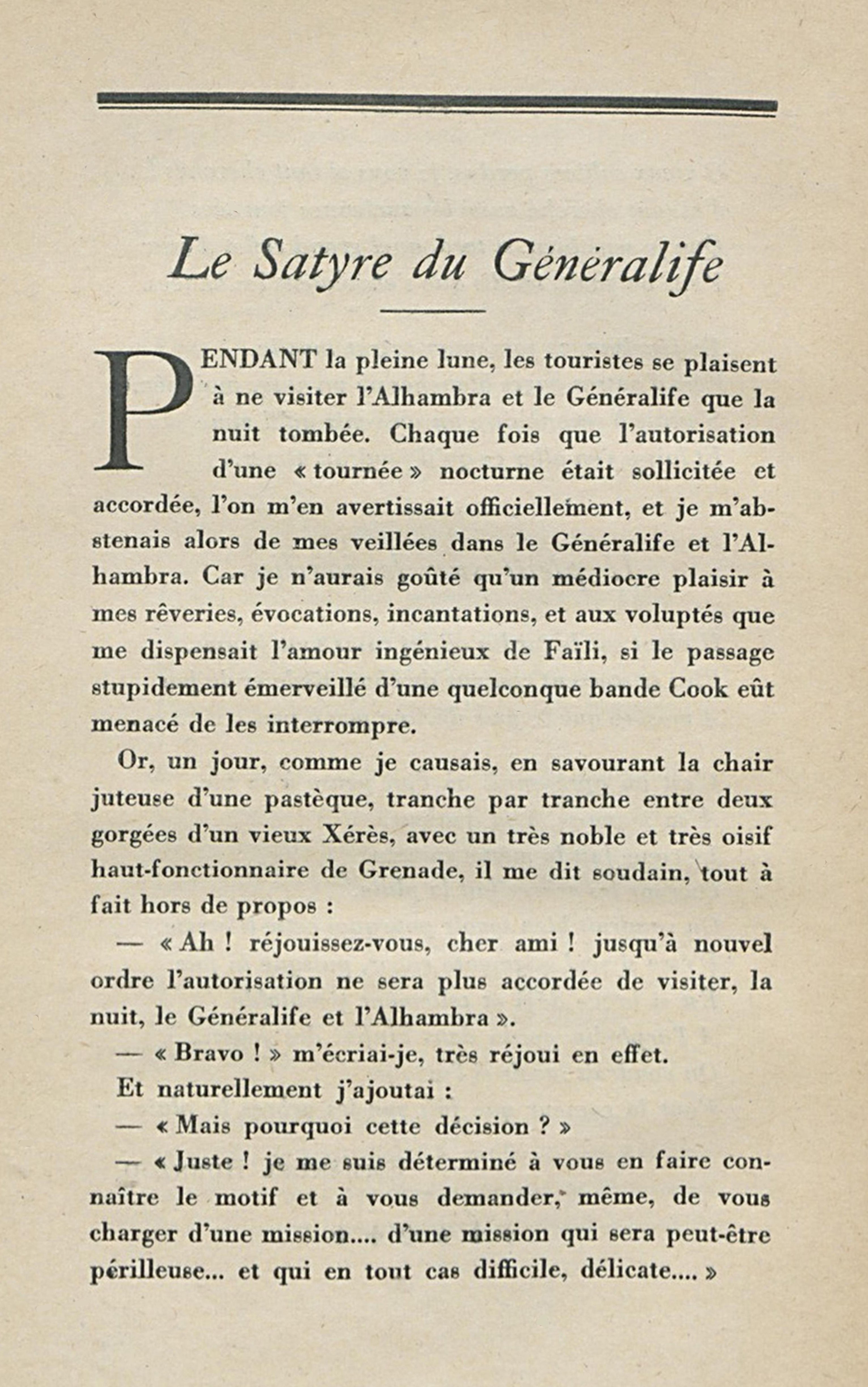 Pendant la pleine lune, les touristes se plaisent à ne visiter l’Alhambra et le Généralife que la nuit tombée. Chaque fois que l’autorisation d’une « tournée » nocturne était sollicitée et accordée, l’on m’en avertissait officiellement, et je m’abstenais alors de mes veillées dans le Généralife et l’Alhambra. Car je n’aurais goûté qu’un médiocre plaisir à mes rêveries, évocations, incantations, et aux voluptés que me dispensait l’amour ingénieux de Faïli, si le passage stupidement émerveillé d’une quelconque bande Cook eût menacé de les interrompre.