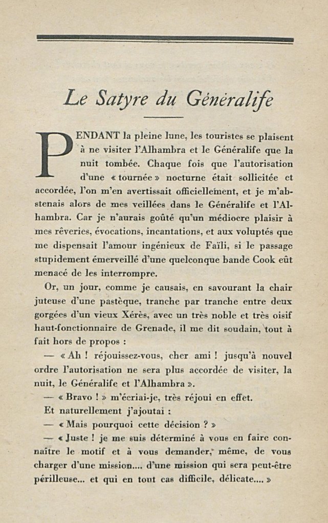 Depuis trois mois, à chaque période de pleine lune, d’énigmatiques disparitions avaient été douloureusement constatées parmi les visiteurs de l’Alhambra et du Généralife. Oui, sept jeunes filles, en trois mois, avaient disparu. Sept jeunes filles ! et disparues complètement. On les avait vu entrer dans le Généralife, avec la bande des parents, amis, compagnons de voyage ; on ne les avait pas vu sortir. Dans la nuit des jardins, elles s’étaient comme volatilisées. Très discrètement et adroitement conduites, les enquêtes avaient cependant établi que les jeunes filles disparues – l’une et l’autre, toutes sans exception – s’étaient attardées, avec ou sans motif connu, derrière la caravane touristique dont elles faisaient partie. Elles s’étaient attardées, oh ! pour une demi-minute ! elles s’étaient laissé distancer, volontairement ou non – et elles n’avaient pas reparu. On ne trouvait d’elles aucune trace. Entrées dans le Généralife, on ne voyait pas qu’elles en fussent sorties, jamais. Et dans le Généralife, rien, absolument rien de ces disparues n’avait été découvert. Notez bien que, pendant les visites marquées d’une disparition mystérieuse, – sept visites, une seule disparition chaque fois, – d’autres personnes, hommes et femmes, avaient été plus ou moins distancées, isolément, par le gros de la caravane, à la sortie d’une chambre, au tournant d’une allée : hommes de tout âge et femmes faites ou d’âge mûr. Les unes et les autres avaient rejoint la caravane sans incident d’aucune nature. Les seules personnes qui, en d’identiques circonstances, n’avaient pas rejoint, étaient des jeunes filles, de vraies jeunes filles. Et toutes les disparues – on put l’établir avec certitude – avaient perdu le contact de la caravane au même endroit du Généralife, à l’angle brusque d’une certaine allée, là et jamais ailleurs…