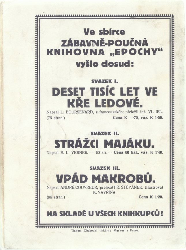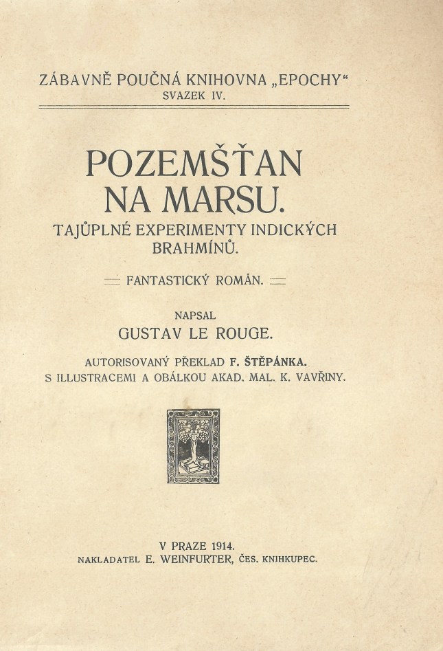 (Édition originale tchèque du Prisonnier de la planète Mars de Gustave Le Rouge ; Pozemšťan na Marsu, tajůplné experimenty indických brahmínů : fantastický román, Prague : Eduard Weinfurter, 1915. Ne pas hésiter à cliquer sur les images pour les agrandir)
