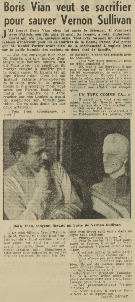 J’ai trouvé Boris Vian chez lui après le déjeuner. Il s’amusait avec Patrick, son fils aîné (4 ans). Sa femme, à côté, endormait Carol qui n’a que quelques mois. Tout cela formait un ravissant tableau d’intérieur pour les calendriers de la Bonne Presse. J’ai pensé que M. Daniel Parker avait bien de la méchanceté à vouloir jeter sur la paille humide des cachots ce doux chef de famille.