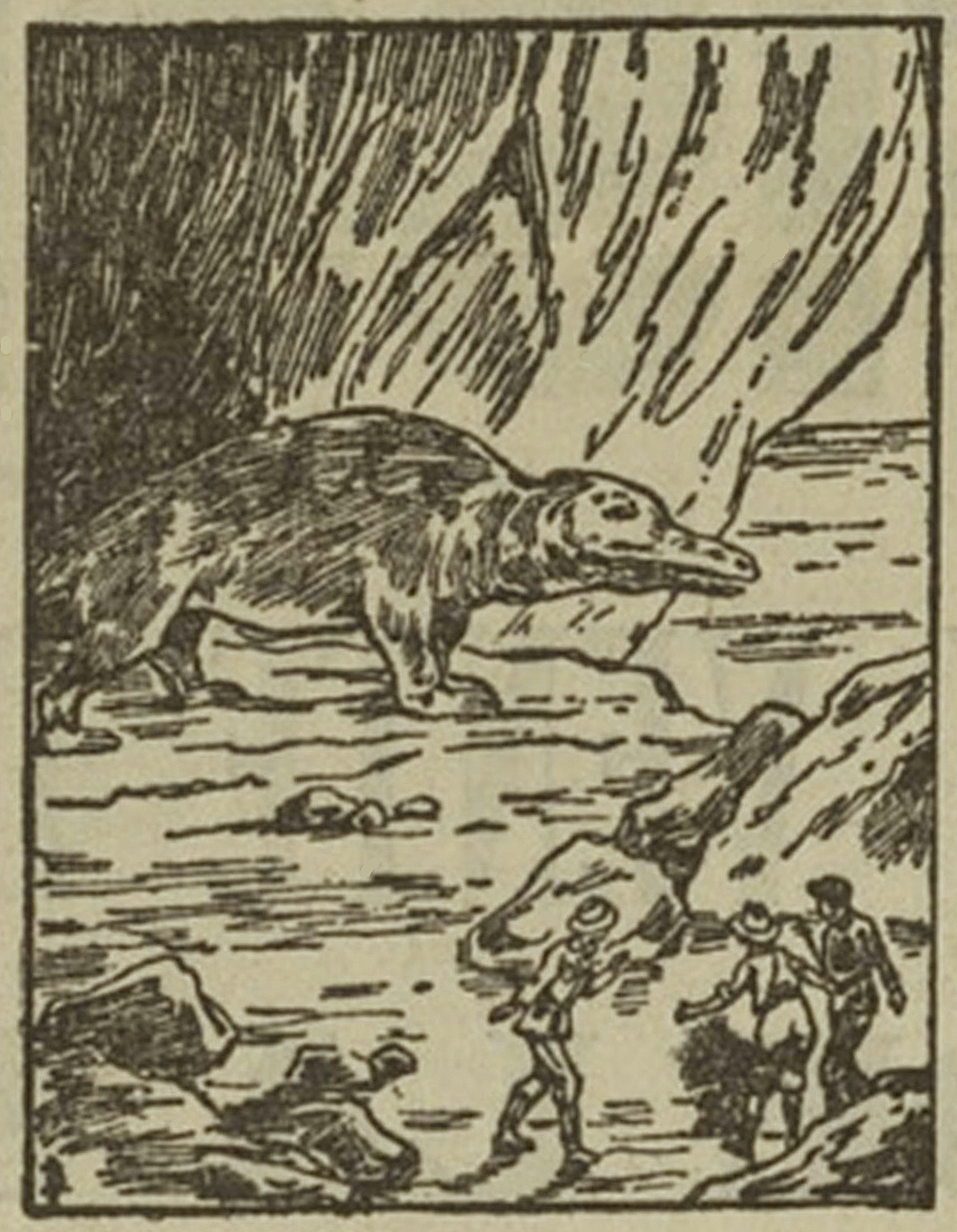 Ô vengeance inespérée du sort ! Le mégalosaure s’en fut aux flots, comme je vous le dis, et saisit dans ses formidables mâchoires l’un de ces poulpes maudits, hacha ses tentacules et fit disparaître le tout dans son gosier : un magasin pour la capacité. Le mets devait être savoureux, car le mégalosaure abaissa de nouveau sa grosse tête dans les vagues et la releva, tenant un second céphalopode dans sa gueule. Nous ne pensions plus à fuir et, pour mon compte, j’étais sidéré. Par quelle suite de circonstances inimaginables, cet animal dix fois millénaire, que les paléontologistes s’accordent à déclarer disparu de la faune actuelle, vivait-il encore ? Comment ce terrien mangeur d’iguanodons et de lézards géants pouvait-il se contenter de pieuvres comme nourriture ? By Jove ! Sans aucun doute prisonnier dans cette caverne depuis des siècles de siècles, à la suite d’une révolution géologique, il avait dû chercher des aliments nouveaux et revenir à ceux de ses ancêtres, le plésiososaure et l’ichtyosaure. Mais comment pouvait-il ne pas être mort ?
