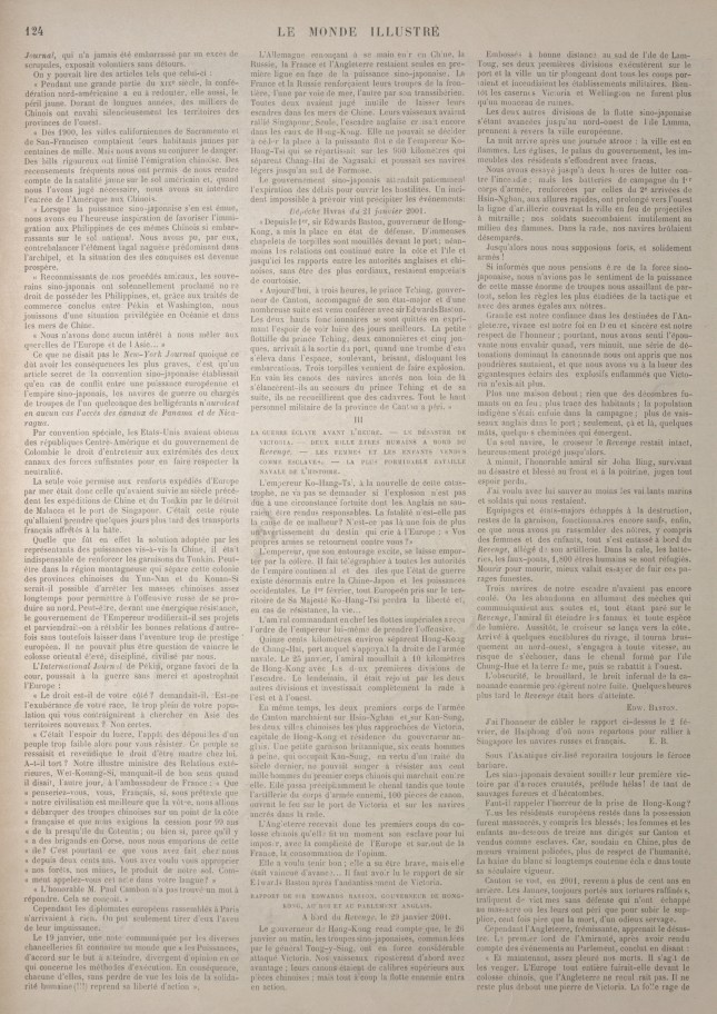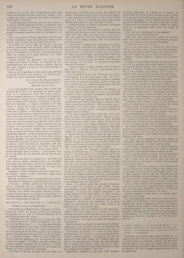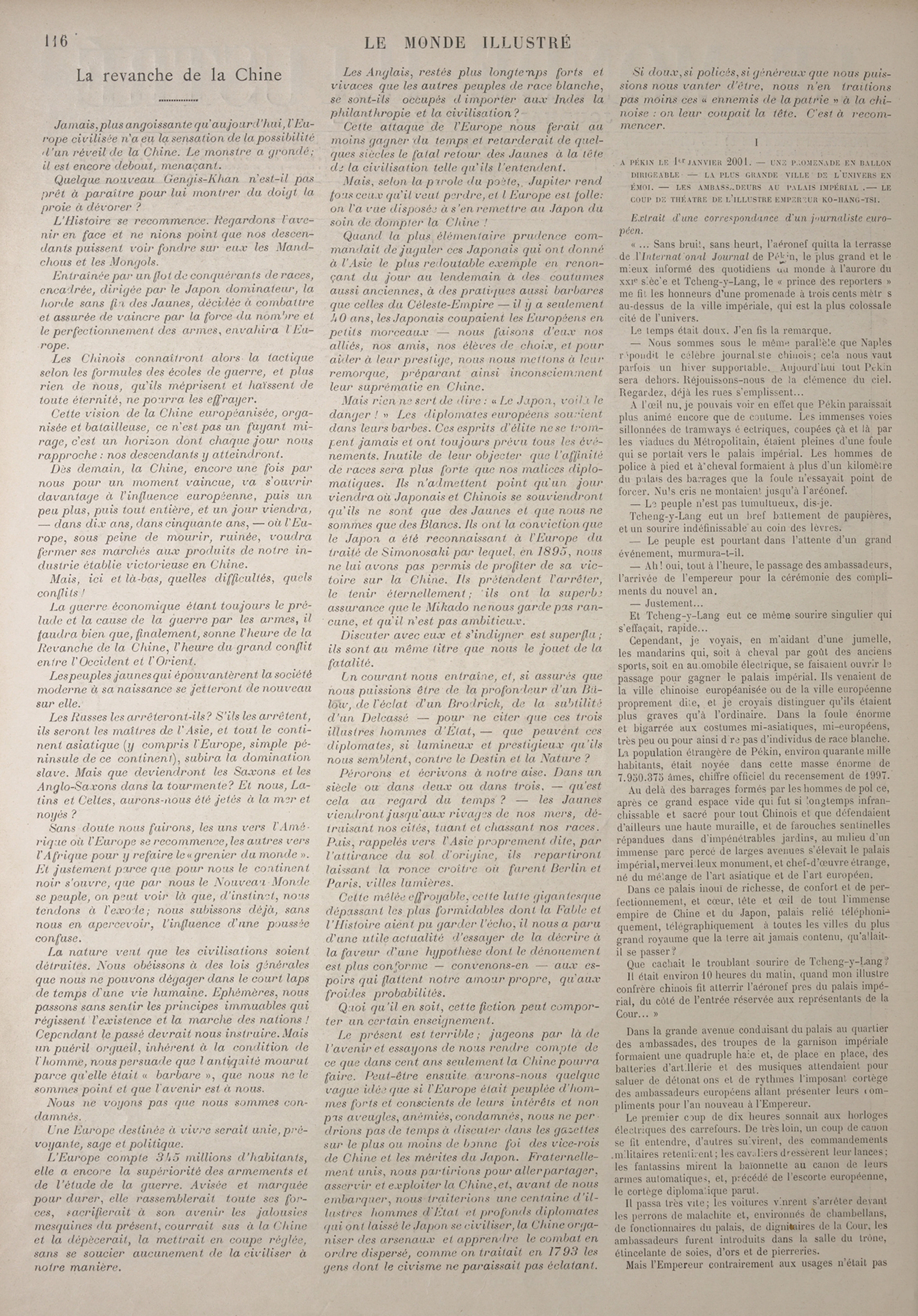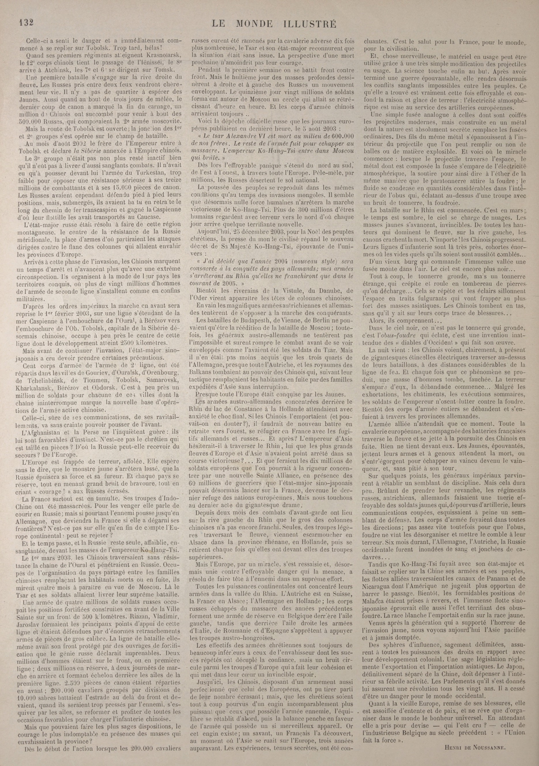 « La Porte ouverte » met aujourd’hui en ligne un récit conjectural d’Henri Rossignol de Noussanne sur le thème du Péril jaune : « La Revanche de la Chine, » occupant la quasi-totalité du numéro du Monde illustré du 25 août 1900. Les lecteurs désireux d’en connaître davantage sur l’auteur pourront se reporter à l’article que lui a consacré le site « ArchéoSF » en avril 2919.