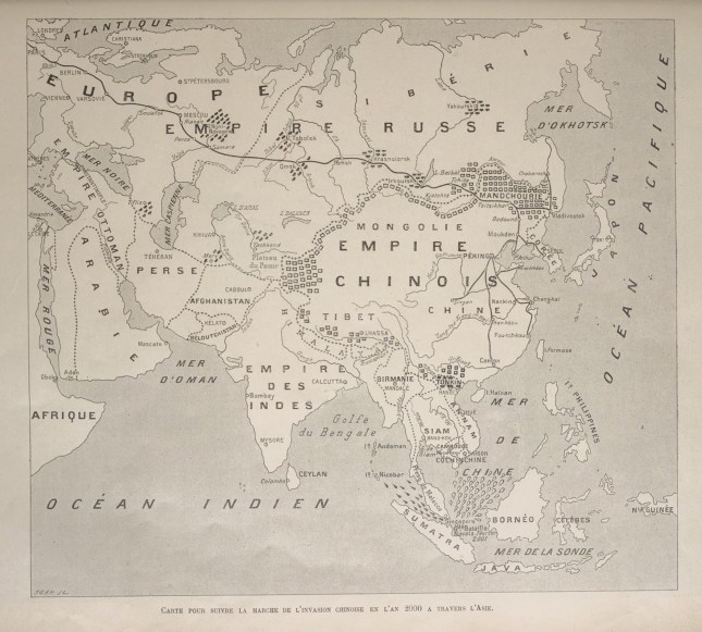« Dans un siècle ou dans deux ou dans trois, – qu’est cela au regard du temps ? – les Jaunes viendront jusqu’aux rivages de nos mers, détruisant nos cités, tuant et chassant nos races. Puis, rappelés vers l’Asie proprement dite, par l’attirance du sol d’origine, ils repartiront, laissant la ronce croître où furent Berlin et Paris, villes lumières. »