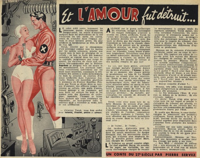 Ils ont, par leurs gestes, contracté une étrange maladie disparue depuis des milliers d’années : l’Amour. À partir de ce moment, des choses graves se produisirent au labo 82. La blonde Manoua ne réussit plus ses expériences. Torak se met à écrire des textes dénués de tout intérêt scientifique ou mathématique. Caro, chef du laboratoire, découvre même un matin un brin d’herbe, poussé avec sa fleur dans un verre à essais rempli de terre. Il fait un rapport. Torak est déplacé dans une lointaine province… Sa maladie, par contagion, est capable de détruire le bel équilibre de la cité.