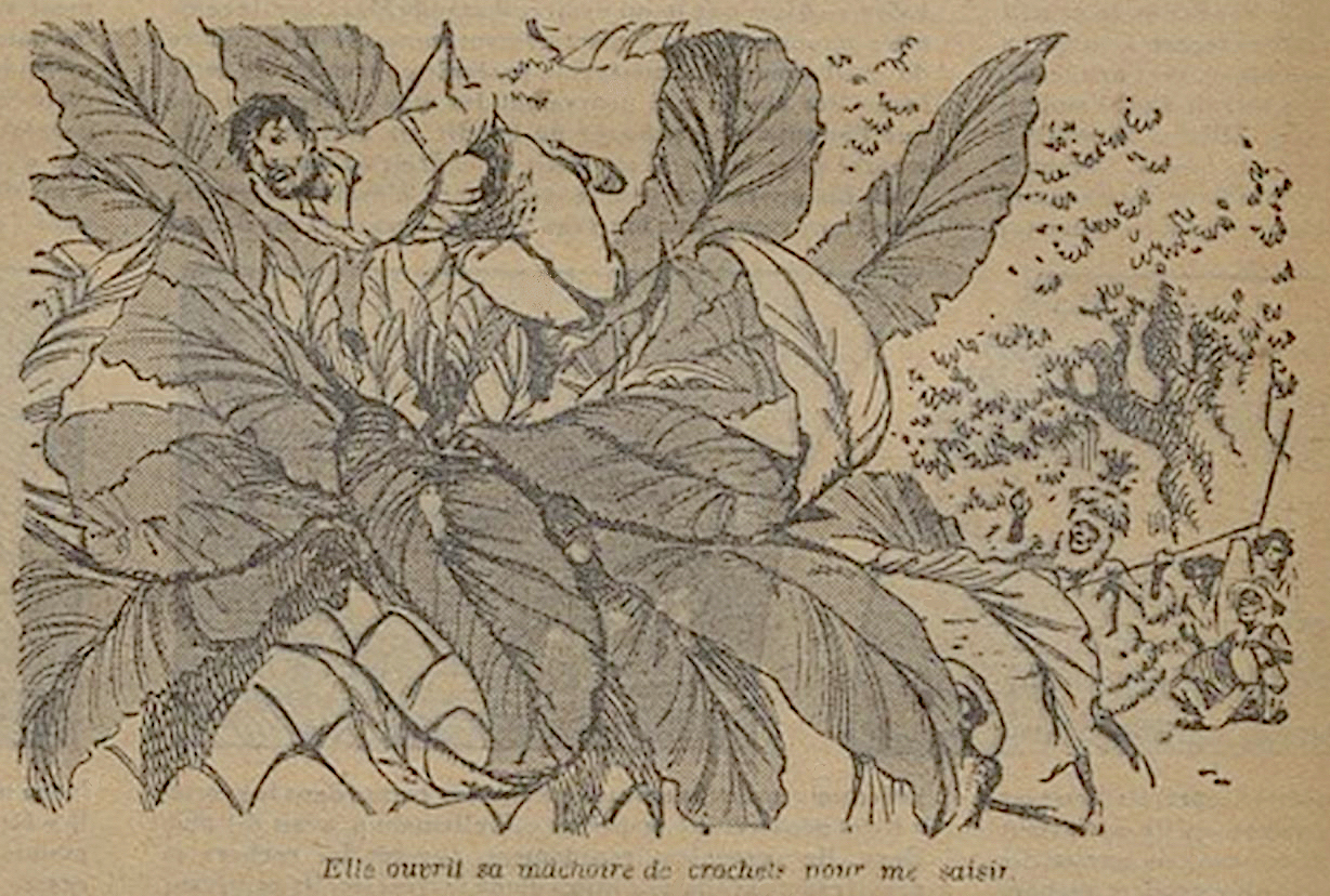 Je ne fus pas long à comprendre que cette plante inconnue était une sorte de dieu de ces moricauds et que c’était, ce jour-là, le jour où l’on célébrait ses mystères. Je me demandais ce que mes ravisseurs allaient faire de moi, quand le sorcier officiant attaqua une sorte de chant lugubre et guttural ; après quoi, un cortège trépidant apporta en grande pompe une antilope, liée, elle aussi, mais vivante. C’est seulement alors que je m’aperçus qu’une sorte de trépied, fait de trois gros mâts réunis par le haut, se dressait au-dessus de la plante et portait un appareil analogue à un palan, qui, après toutes sortes de simagrées, servit aux noirs à hisser l’antilope au-dessus des crocs de la plante, qui se refermèrent sur la bête aussitôt qu’en se débattant elle les eût touchés. Mais, presque aussitôt, je vis qu’elle devenait inerte comme un patient chloroformé. Insensiblement, les puissantes mâchoires attirèrent l’animal qui disparut à l’intérieur de cette étrange tombe végétale. Je compris être en présence de la plante monstrueuse dont avaient parlé les porteurs.