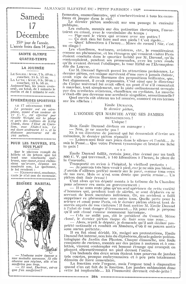 « Il ne nous reste plus qu’un seul spécimen de cette variété d’hommes qui, pendant tant de siècles, se sont déplacés en se servant de leurs membre inférieurs. Or, un accident a failli supprimer ce phénomène rare entre tous. Quelle perte pour la science et aussi pour Paris, où le dernier piéton obtient tant de succès auprès de nos visiteurs ! Il faut mettre M. Émile Durand à l’abri de tout danger d’écrasement… Et pour cela, je propose qu’il soit classé comme monument historique.
