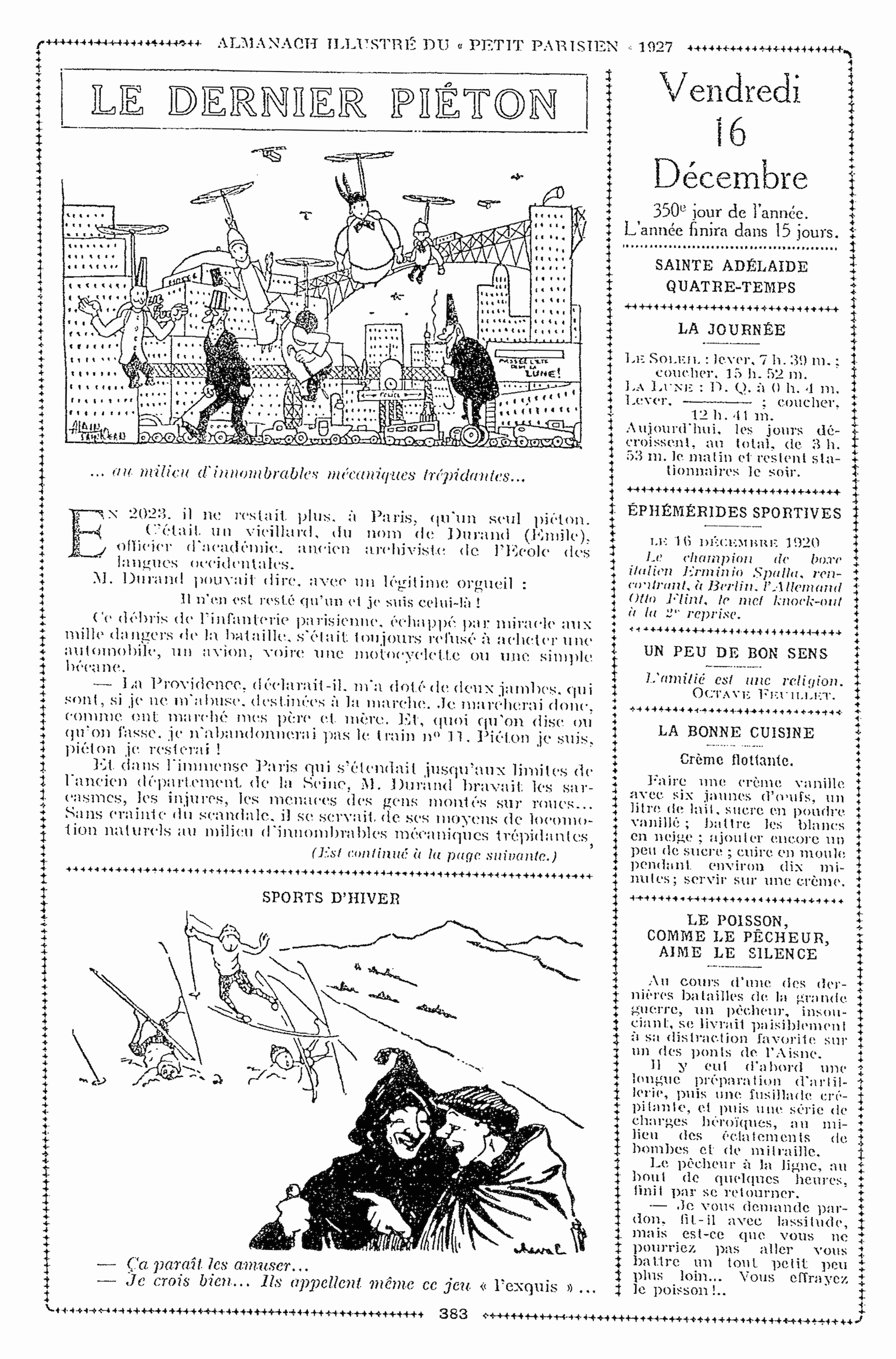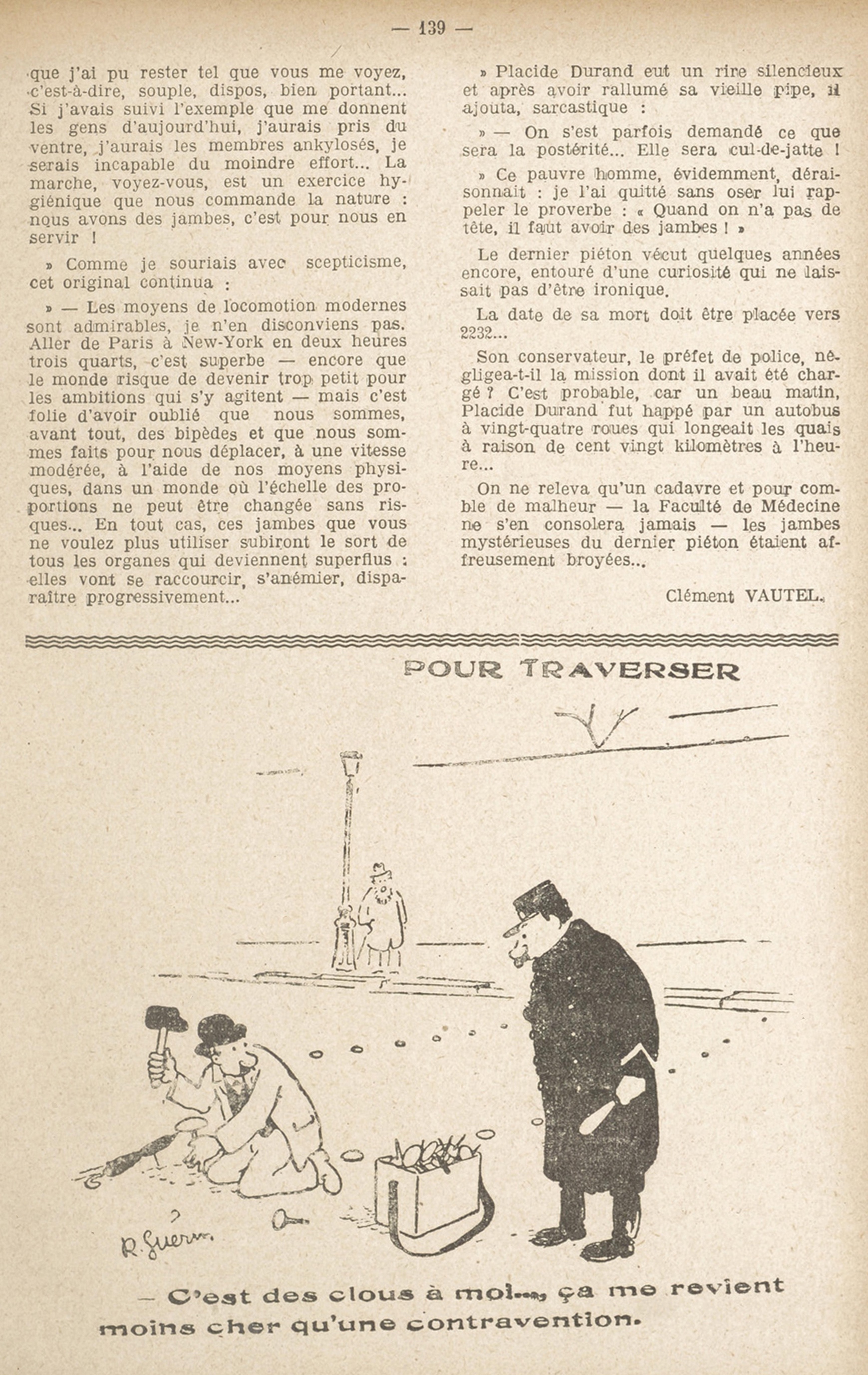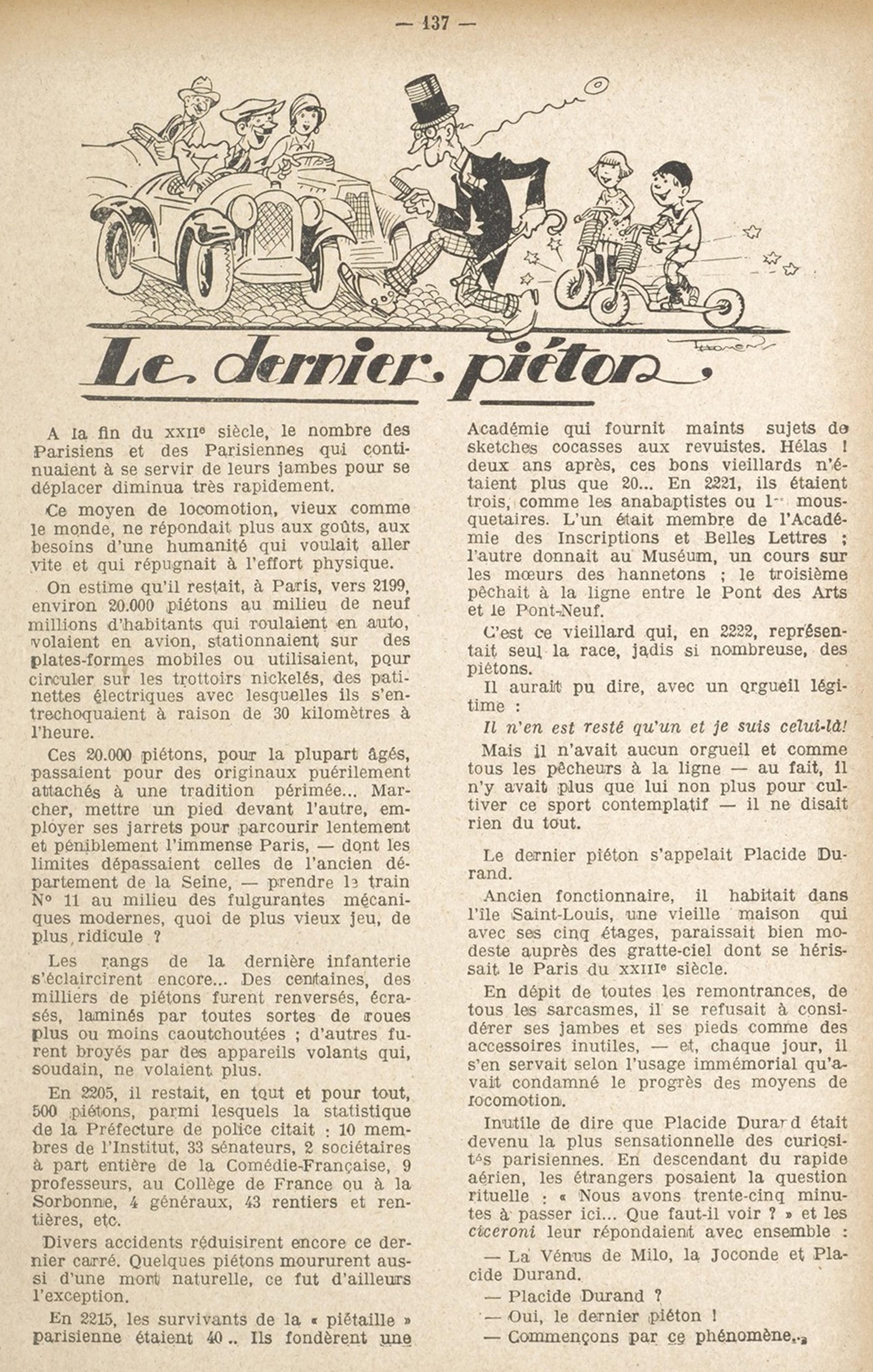 On estime qu’il restait, à Paris, vers 2199, environ 20.000 piétons au milieu de neuf millions d’habitants qui roulaient en auto, volaient en avion, stationnaient sur des plateformes mobiles ou utilisaient, pour circuler sur les trottoirs nickelés, des patineuses électriques avec lesquelles ils s’entrechoquaient à raison de 30 kilomètres à l’heure.