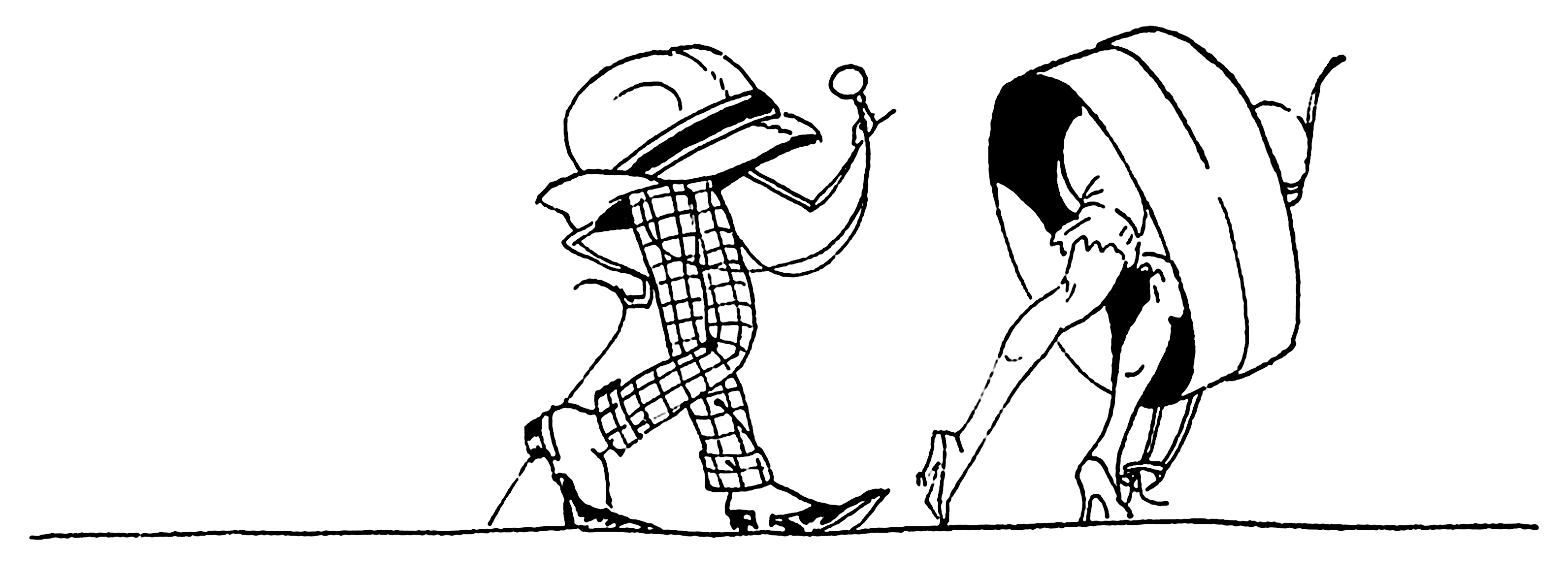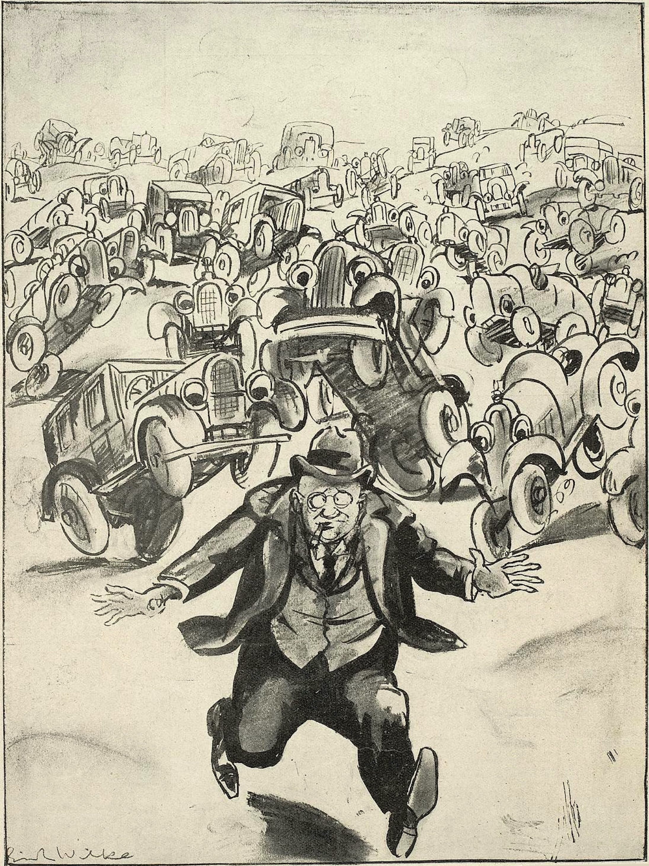 LE PEDESTRIS FAMILISTER. – Espèce peu répandue à Paris, dont l’apparition coïncide généralement avec les expositions internationales d’Art Décoratif et autres manifestations ou solennités ayant quelque retentissement en province. S’inspirant d’une règle de stratégie désuète et tout à fait condamnée par l’expérience des guerres modernes, il se présente toujours en formation serrée sous les roues des automobiles, alors qu’il est admis aujourd’hui que seule la formation dispersée laisse au piéton quelques maigres chances de salut. Muet d’étonnement et pétrifié d’horreur, le témoin impuissant voit le pedestris familister se précipiter poitrine en avant, tenant de la main droite son épouse légitime, de la gauche son fils aîné, de l’autre son parapluie, et entraînant en outre sa vieille sœur, sa servante et son chien, sans compter le ridicule qui vient s’attacher par surcroît à eux tous. Plus tard, rentré dans ses foyers, le pedestris familister racontera longtemps encore sa campagne de Paris, et sourira de pitié quand on viendra à parler devant lui de la difficulté de la circulation dans la capitale : « Pas moinsse ! je leur ai fait voir, à ces « Parisiennes, » comment on s’y prend pour traverser une rue… »