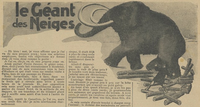 – D’abord, j’eus quelques secondes d’hésitation, puis je sautai sur ma carabine et m’élançai à la poursuite du mammouth ; c’était un mammouth, j’en suis certain, car j’en avais lu la description dans des livres de science durant que j’usais mes fonds de culotte sur les bancs des écoles de Québec. Il avait disparu hors du cirque et s’était engagé dans l’immense steppe glacée dans la direction de la rivière des Diggers.