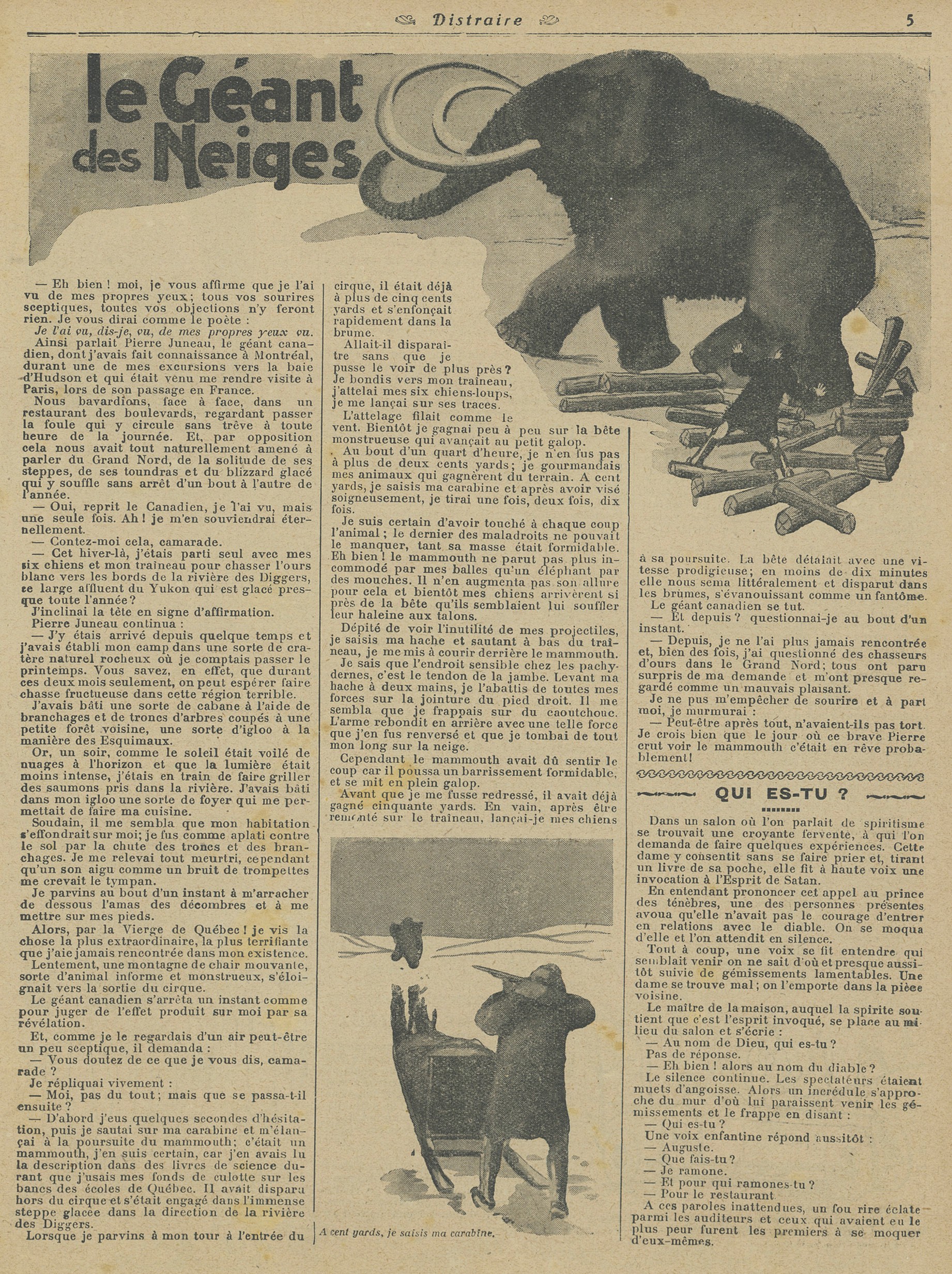 – D’abord, j’eus quelques secondes d’hésitation, puis je sautai sur ma carabine et m’élançai à la poursuite du mammouth ; c’était un mammouth, j’en suis certain, car j’en avais lu la description dans des livres de science durant que j’usais mes fonds de culotte sur les bancs des écoles de Québec. Il avait disparu hors du cirque et s’était engagé dans l’immense steppe glacée dans la direction de la rivière des Diggers.