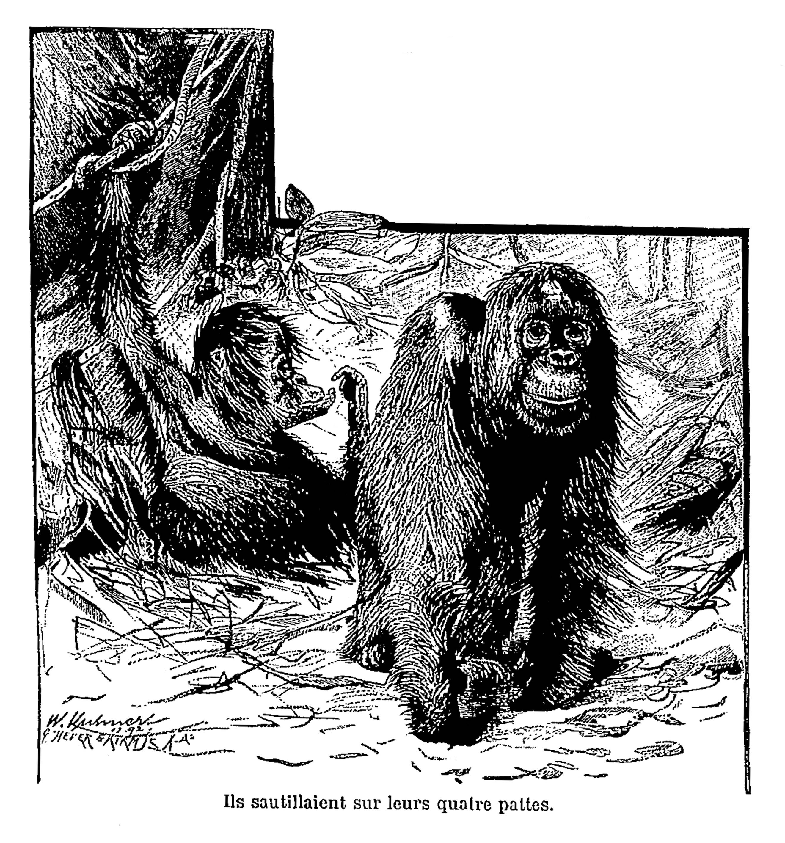 Ils se grattèrent gravement le crâne avec l’orteil du pied gauche, ce qui était chez eux l’indice des plus importantes préoccupations. Sans doute, une résolution fut adoptée séance tenante, car je sentis de nouveau se refermer sur mon bras la main nerveuse de l’orang, et je fus entraîné à travers les ténèbres, escorté d’une cinquantaine de quadrumanes, dont les plus agiles nous précédaient en éclaireurs.