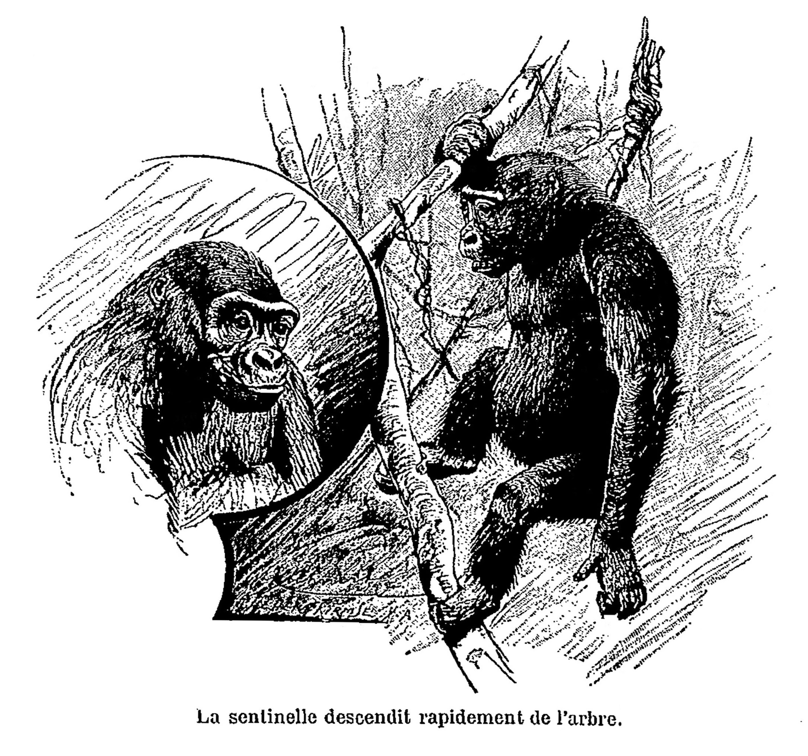 Brusquement, en tournant un rocher, nous fîmes la rencontre d’une famille préhistorique composée de quatre grands quadrumanes.