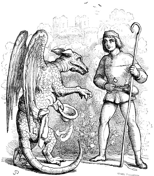 Ils vinrent à terre en même temps sans se séparer, et sans pouvoir se nuire. Cette horrible lutte cependant ne fut pas de longue durée, car le chevalier, étant parvenu à saisir sa dague, en frappa le monstre sous l’aisselle ; la dague entra jusqu’à la garde.