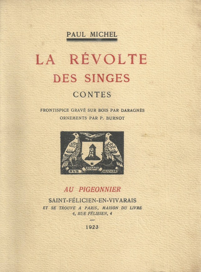 (Paul Michel, La Révolte des singes, contes, frontispice gravé par Daragnès, ornements par P. Burnot, Saint-Félicien-en-Vivarais : Au Pigeonnier, 1923. Tirage limité à 330 exemplaires : 10 ex. sur papier de Monval numérotés de 1 à 10 ; 20 ex. sur vergé d’Arches numérotés de 11 à 30 ; 300 ex. sur vélin Lafuma pur fil)