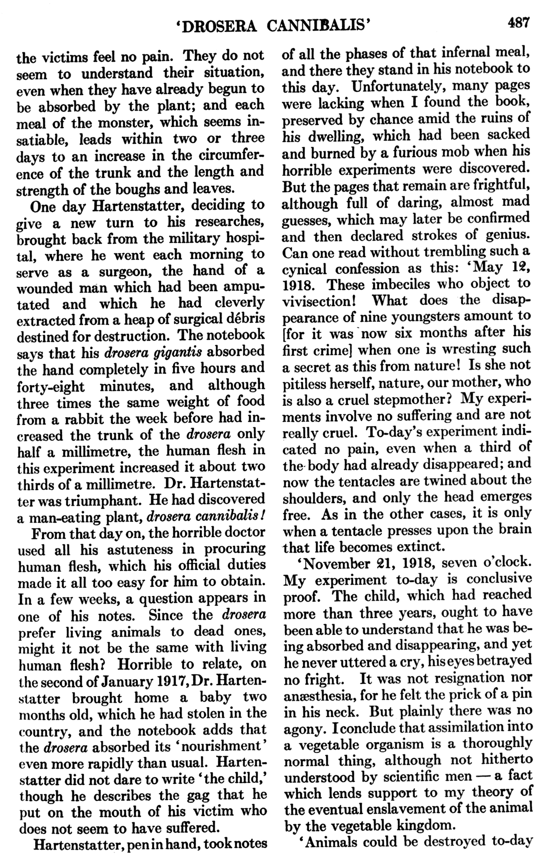 Le carnet note que le droséra a, plus rapidement que de coutume, englué sa « nourriture » ; Hartenstatter n’a pas osé écrire l’enfant ; mais pas de doute, car il décrit le bâillon qu’il a mis sur la bouche de sa victime, qui ne paraît pas souffrir, et qui, cinq heures après avoir eu les jambes saisies par le monstre végétal, a encore assez le goût de vivre pour téter le biberon que l’abominable savant lui met dans la bouche, afin de prolonger l’existence du patient et la durée des observations du savant.