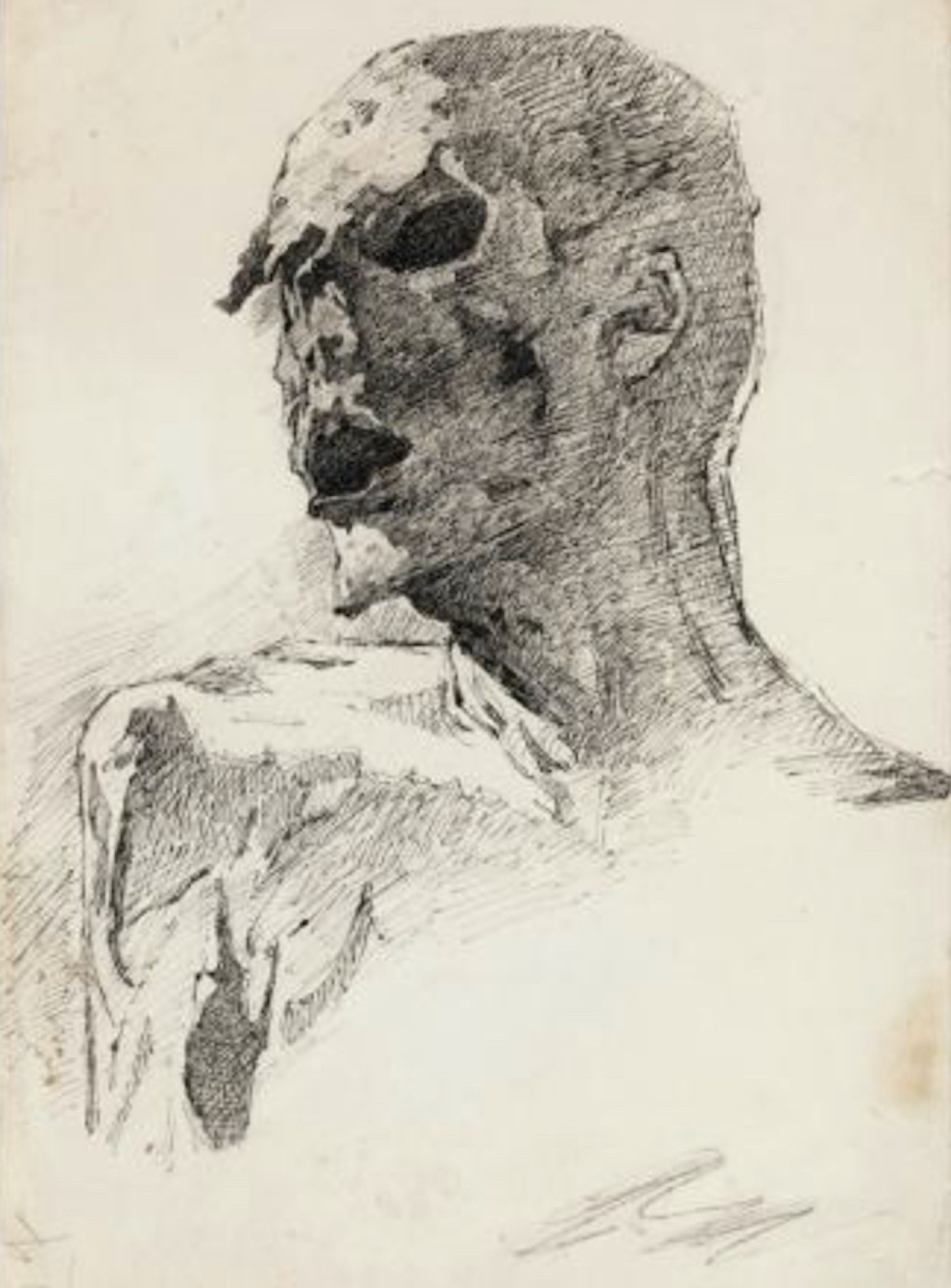 « Un hémiplégique. Voyez la déformation du masque, à gauche. Le bras gauche est collé le long du corps. Pose classique du paralytique. »
