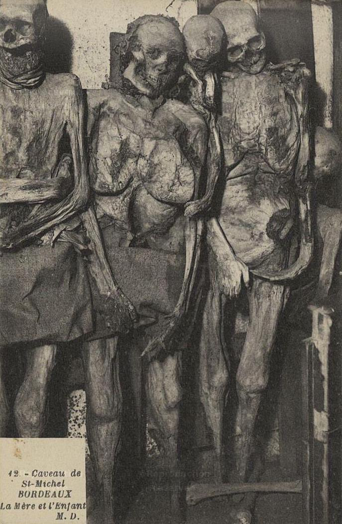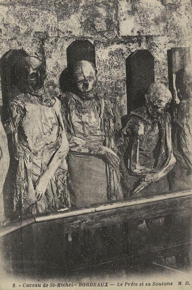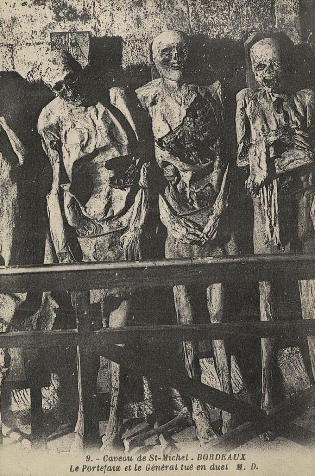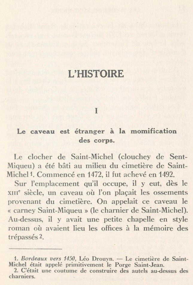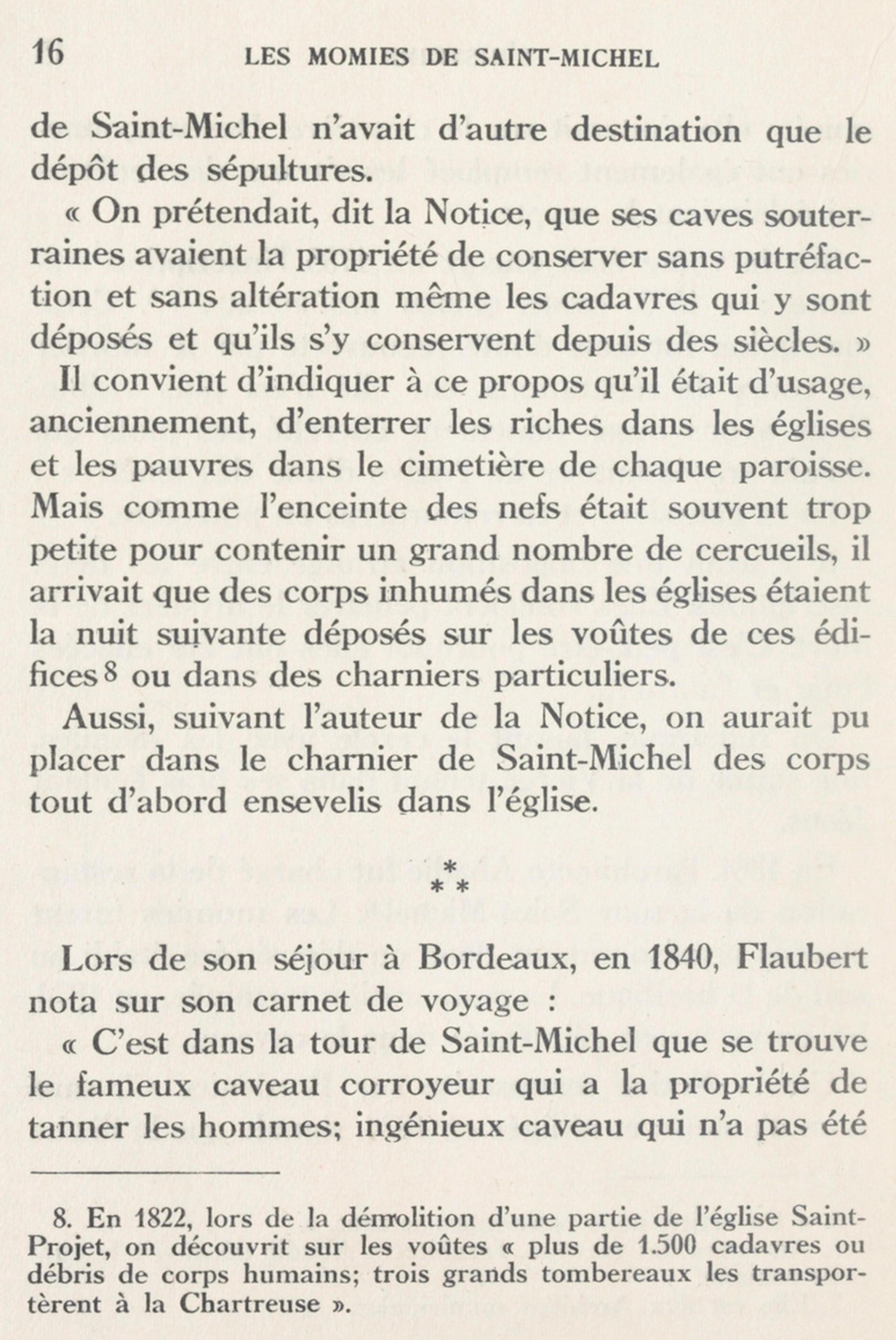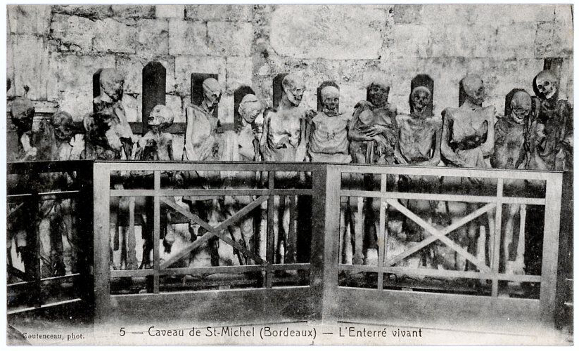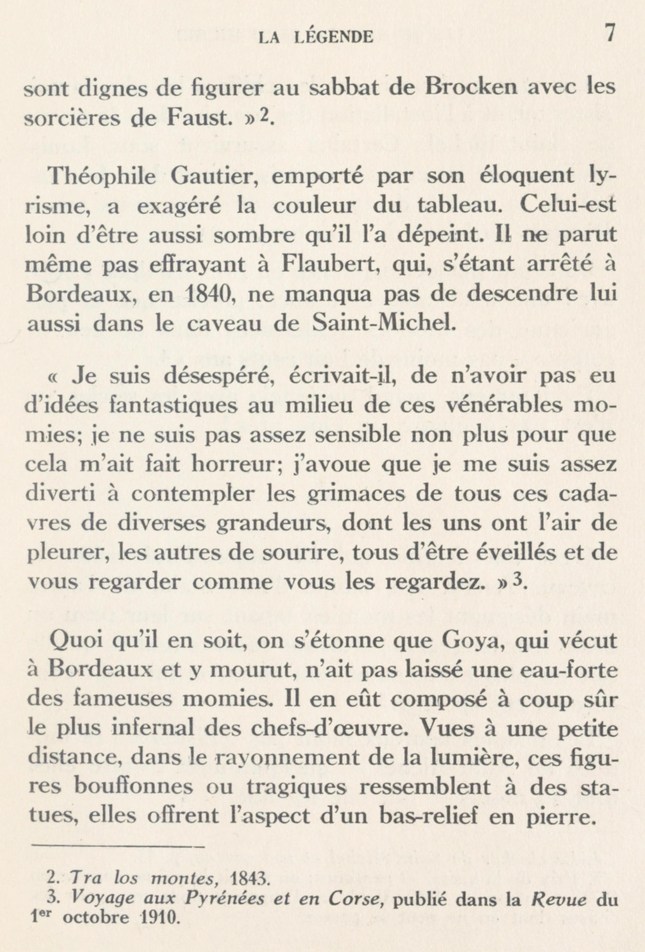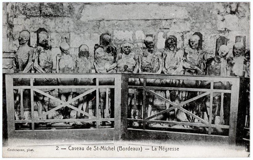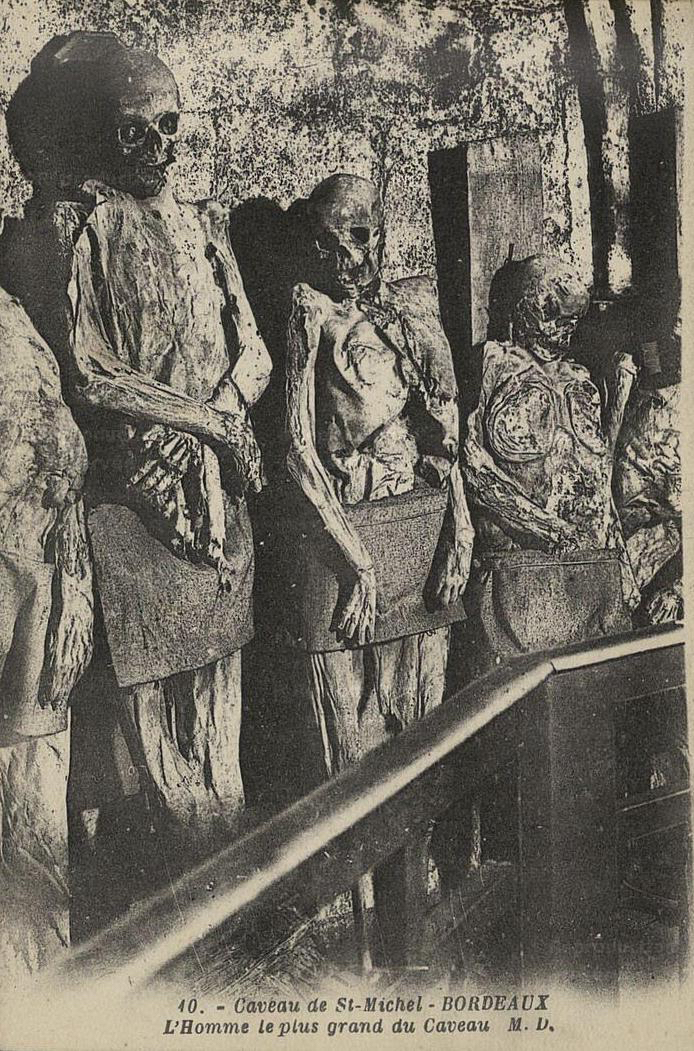 Et cependant, les momies de Saint-Michel demeurent une de nos curiosités locales. Bordeaux a ses momies comme la vieille terre des Pharaons. Après avoir montré la cathédrale, le Palais-Gallien et les quais à son visiteur étranger, le Bordelais se frappe le front et s’écrie : « Té ! Il y a les momies ! » Car il faut une grande occasion pour que le Bordelais pense à ses momies.
