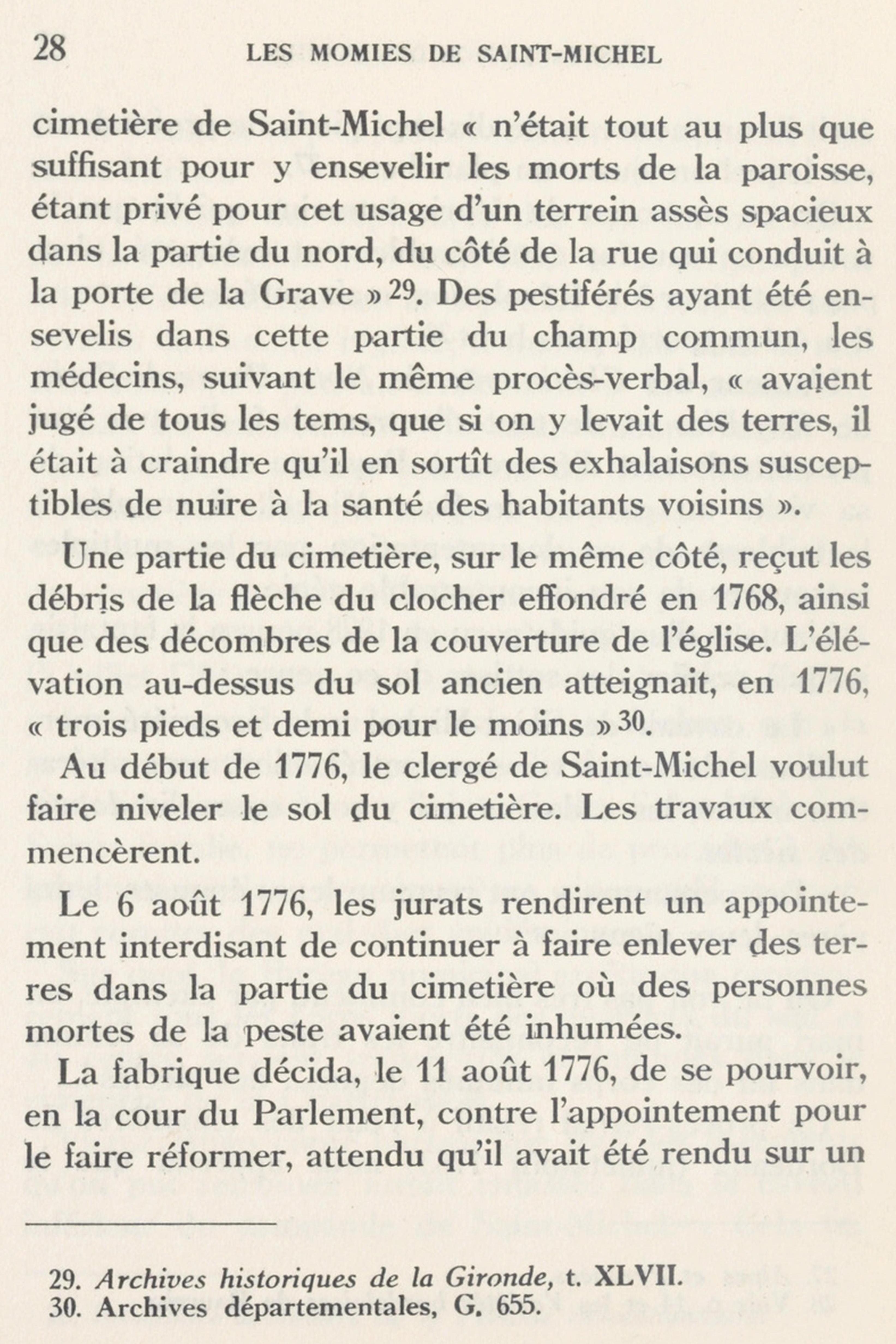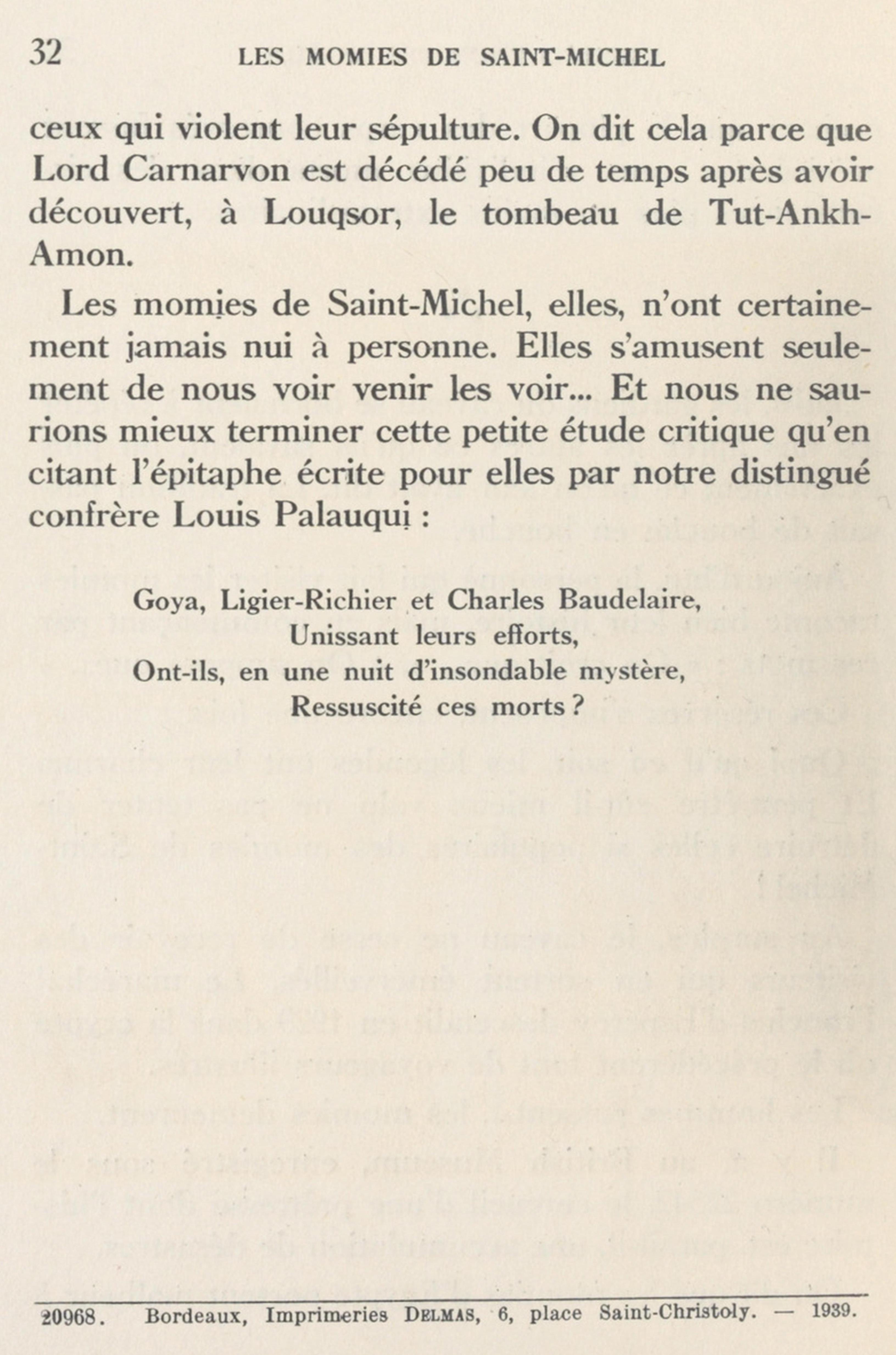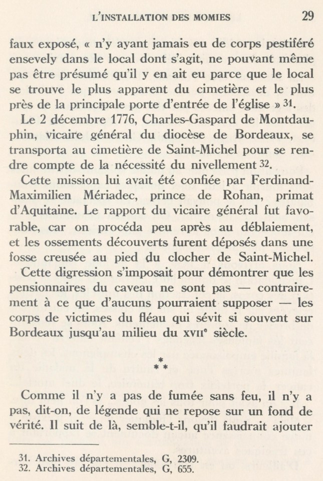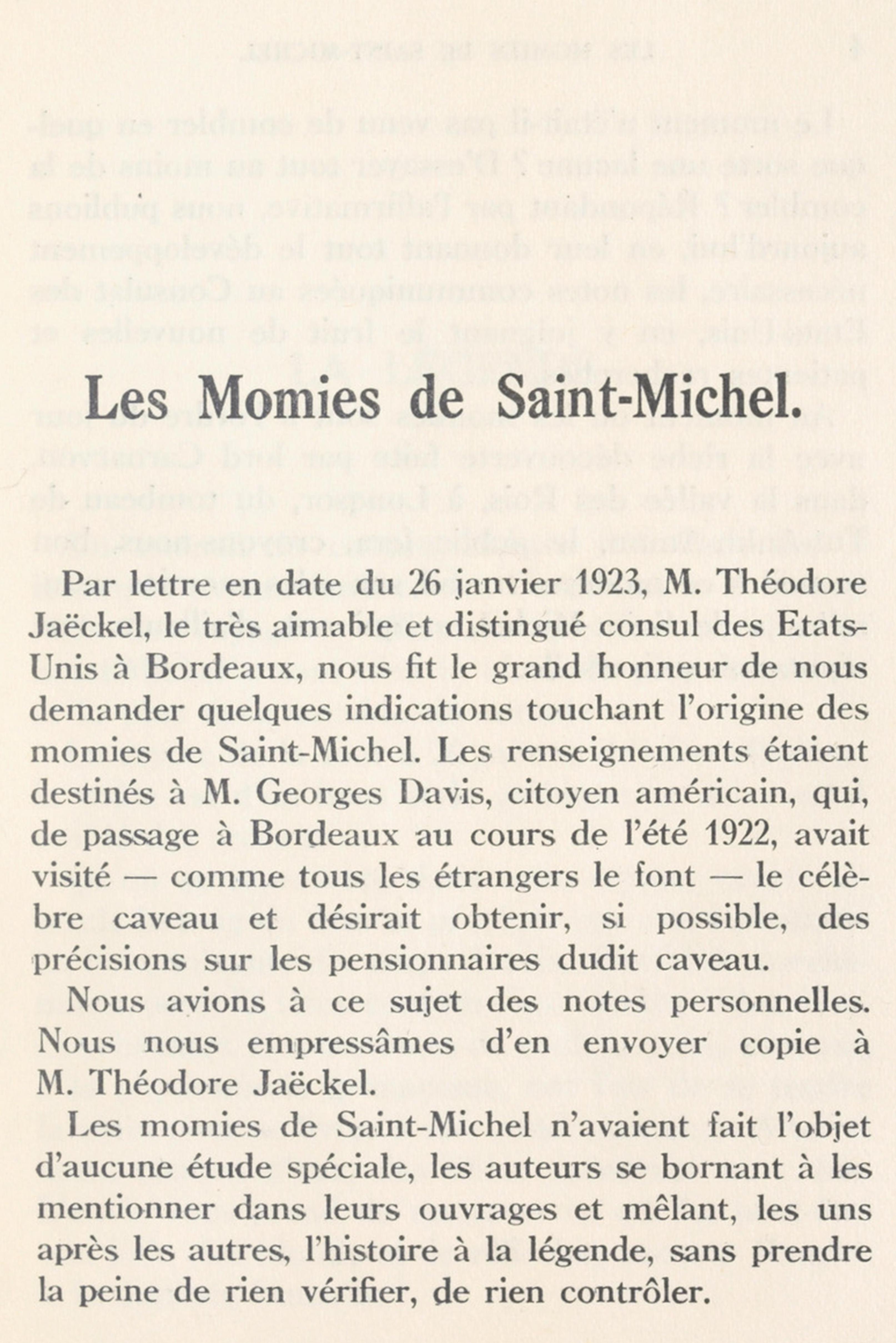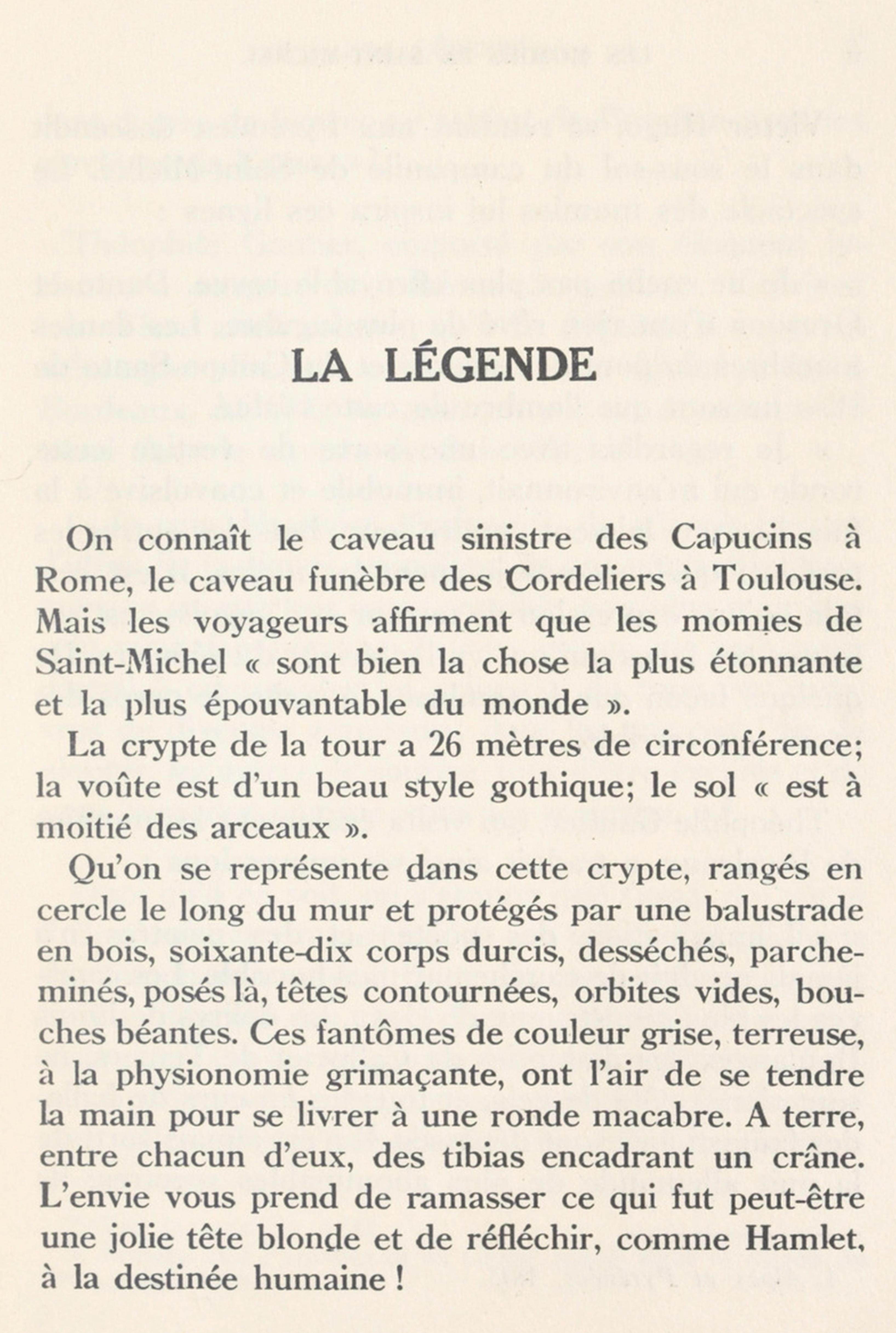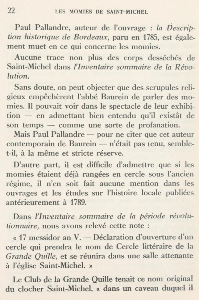 Et cependant, les momies de Saint-Michel demeurent une de nos curiosités locales. Bordeaux a ses momies comme la vieille terre des Pharaons. Après avoir montré la cathédrale, le Palais-Gallien et les quais à son visiteur étranger, le Bordelais se frappe le front et s’écrie : « Té ! Il y a les momies ! » Car il faut une grande occasion pour que le Bordelais pense à ses momies.