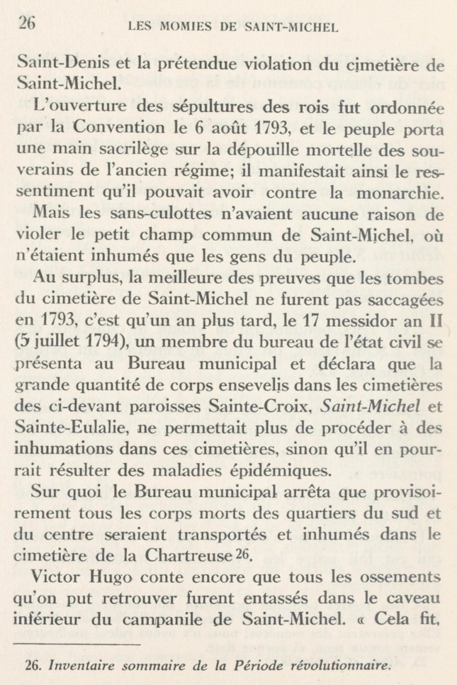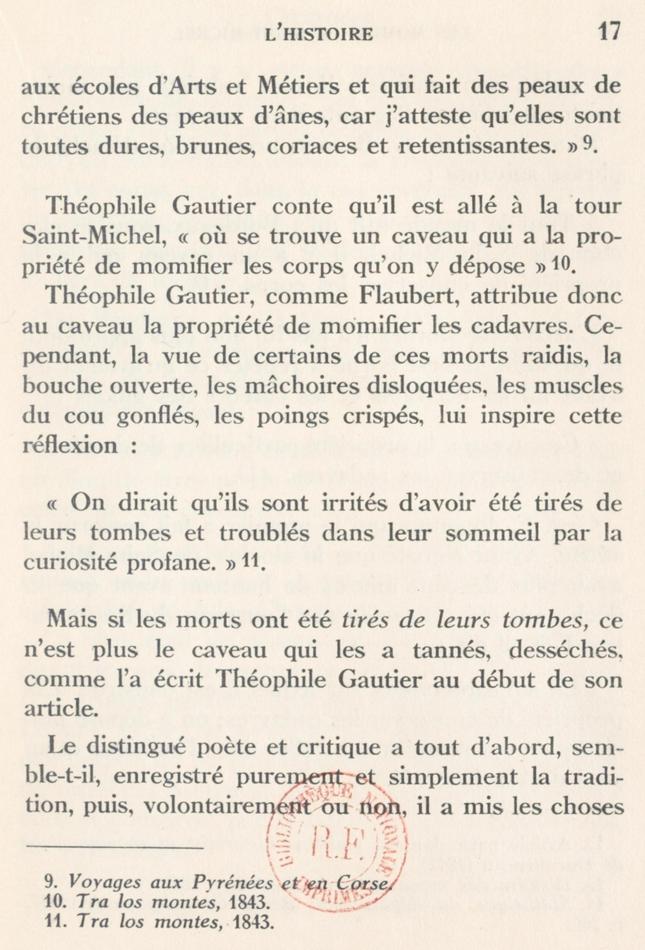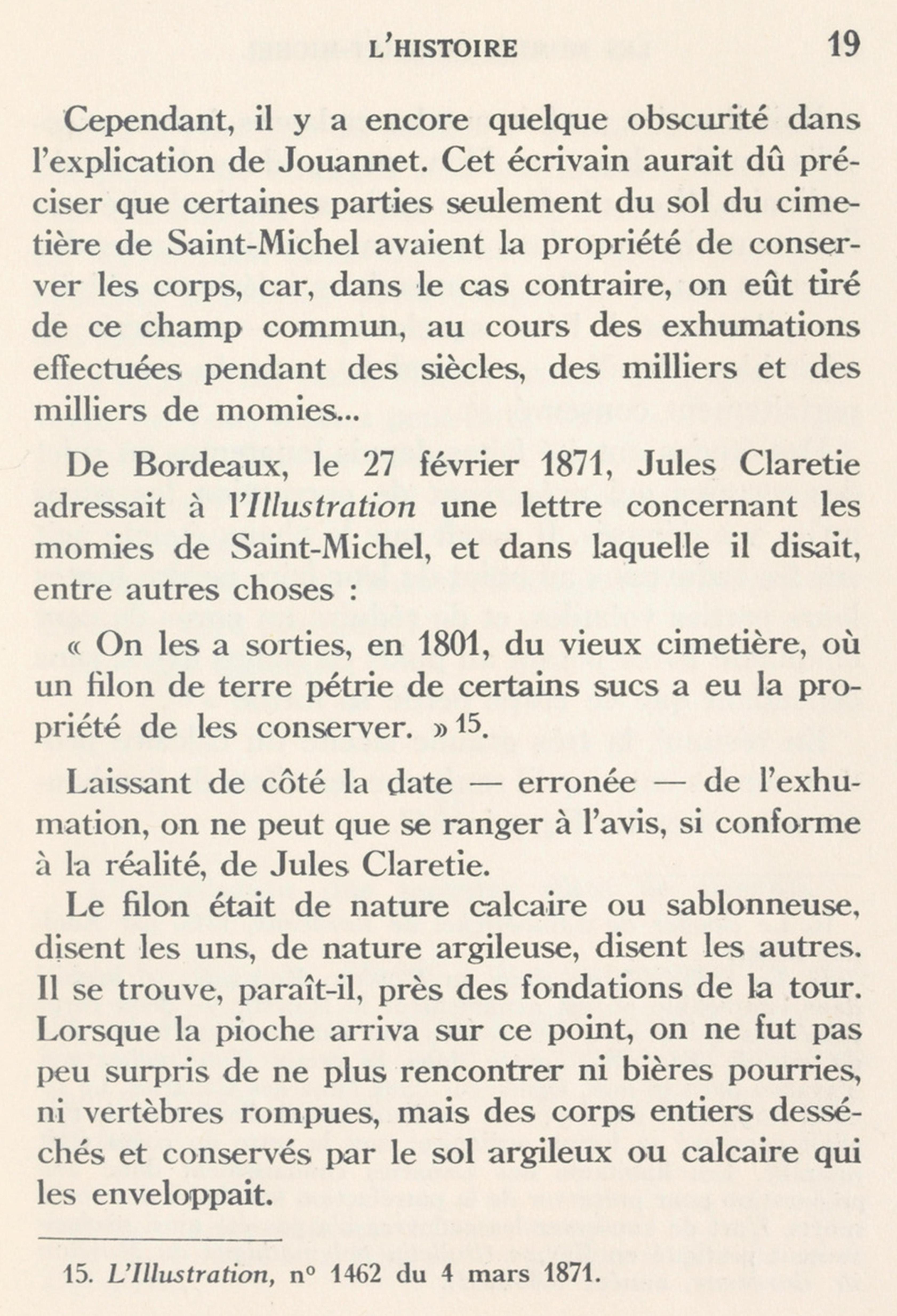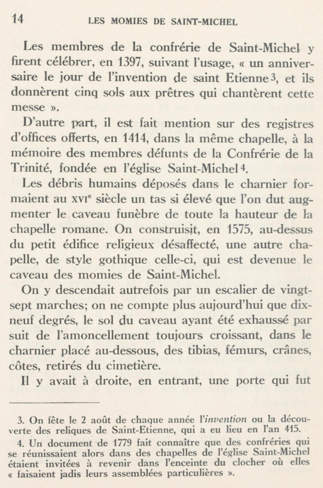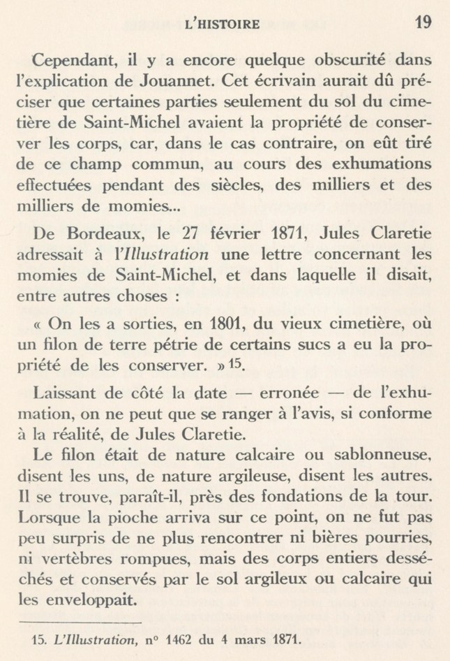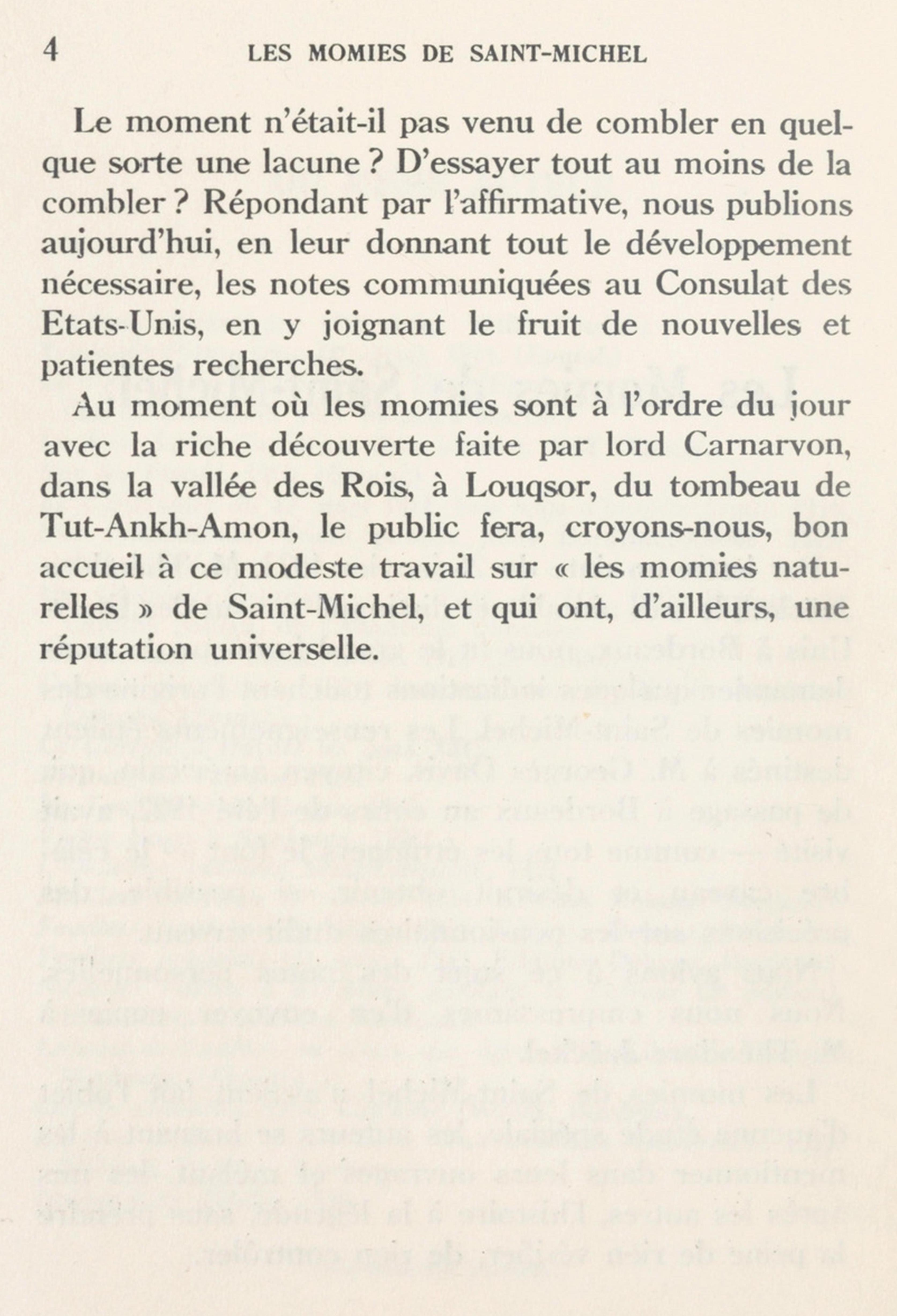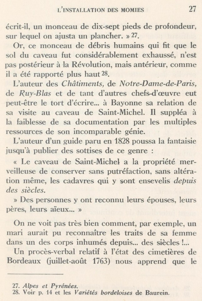 Et cependant, les momies de Saint-Michel demeurent une de nos curiosités locales. Bordeaux a ses momies comme la vieille terre des Pharaons. Après avoir montré la cathédrale, le Palais-Gallien et les quais à son visiteur étranger, le Bordelais se frappe le front et s’écrie : « Té ! Il y a les momies ! » Car il faut une grande occasion pour que le Bordelais pense à ses momies.