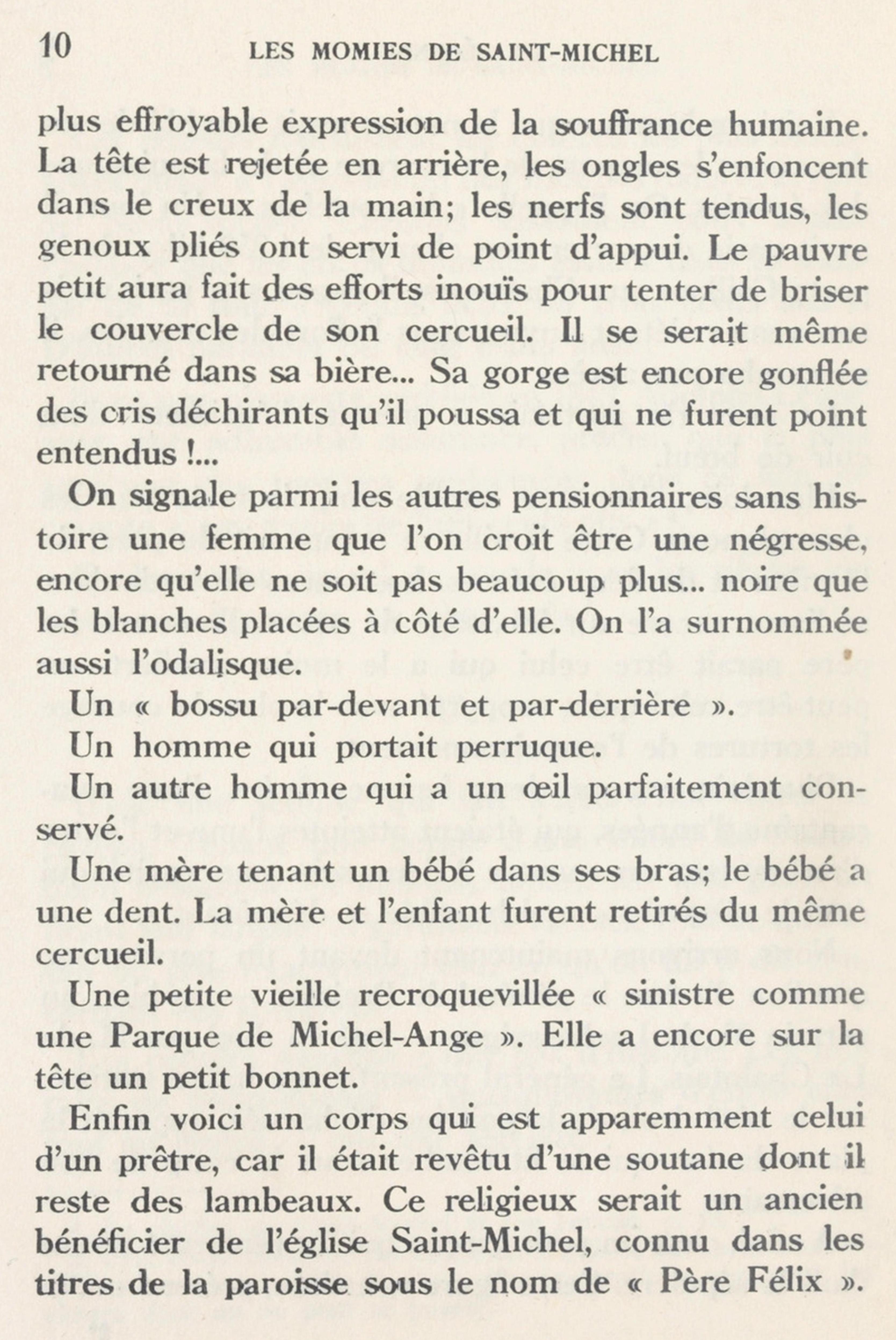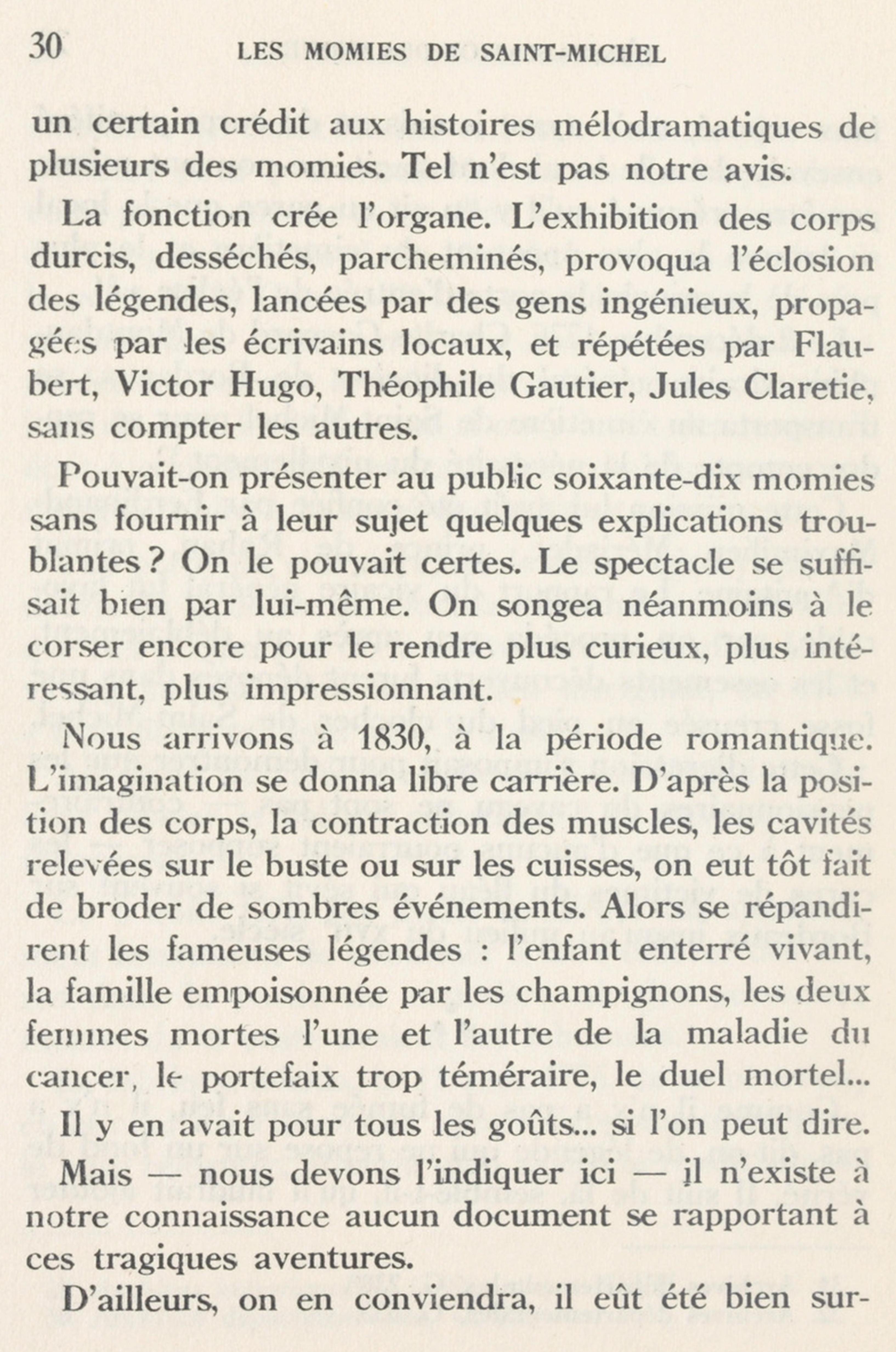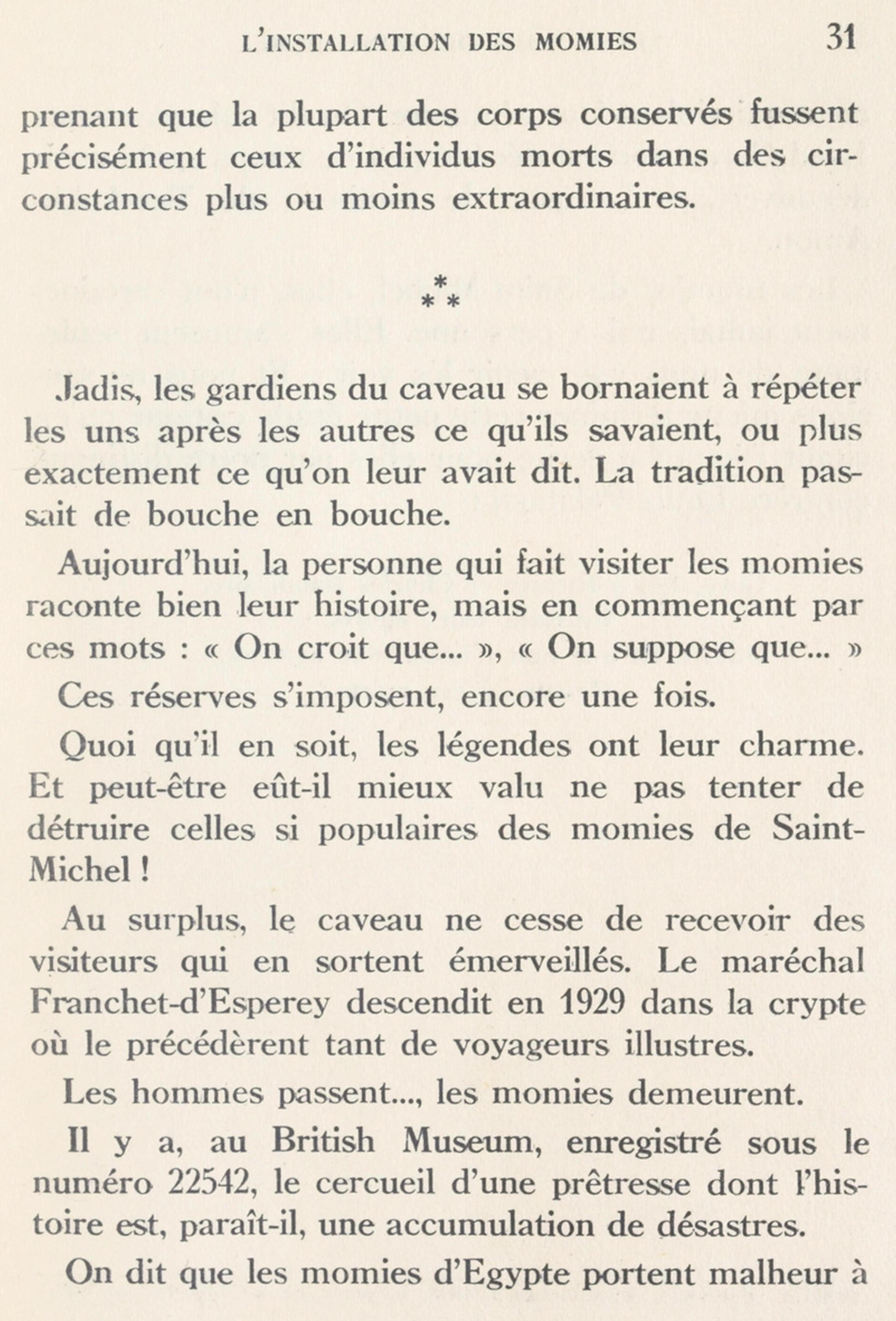 Nous sommes plusieurs petites personnes qui en voulons bigrement à votre collaborateur Maurice Ferrus… S’il avait su qu’il nous ferait tant de peine en publiant Les Momies de Saint-Michel, il aurait laissé son manuscrit se dessécher comme leur peau. Maintenant, le mal est fait…