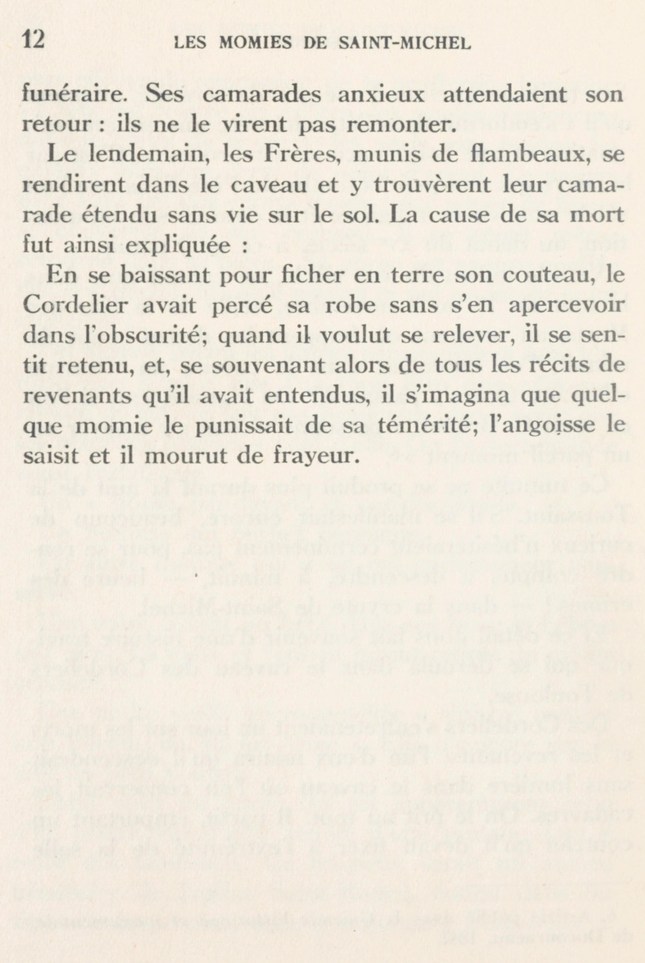 Et la momie, plissant d’un bon sourire sa face parcheminée, heureuse de frôler encore la terre des aïeux, glisse comme une affiche déchirée que le vent promène, et, par la rue Saint-François déserte, regagne gaillardement le caveau de Saint-Michel.