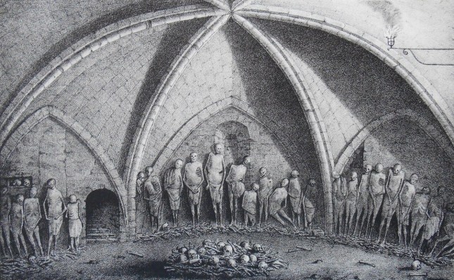 Ceux qu’on vient regarder sous le nez, soixante-dix morts desséchés, sont rangés en cercle le long de la voûte, tout debout, comme s’ils allaient danser la ronde.