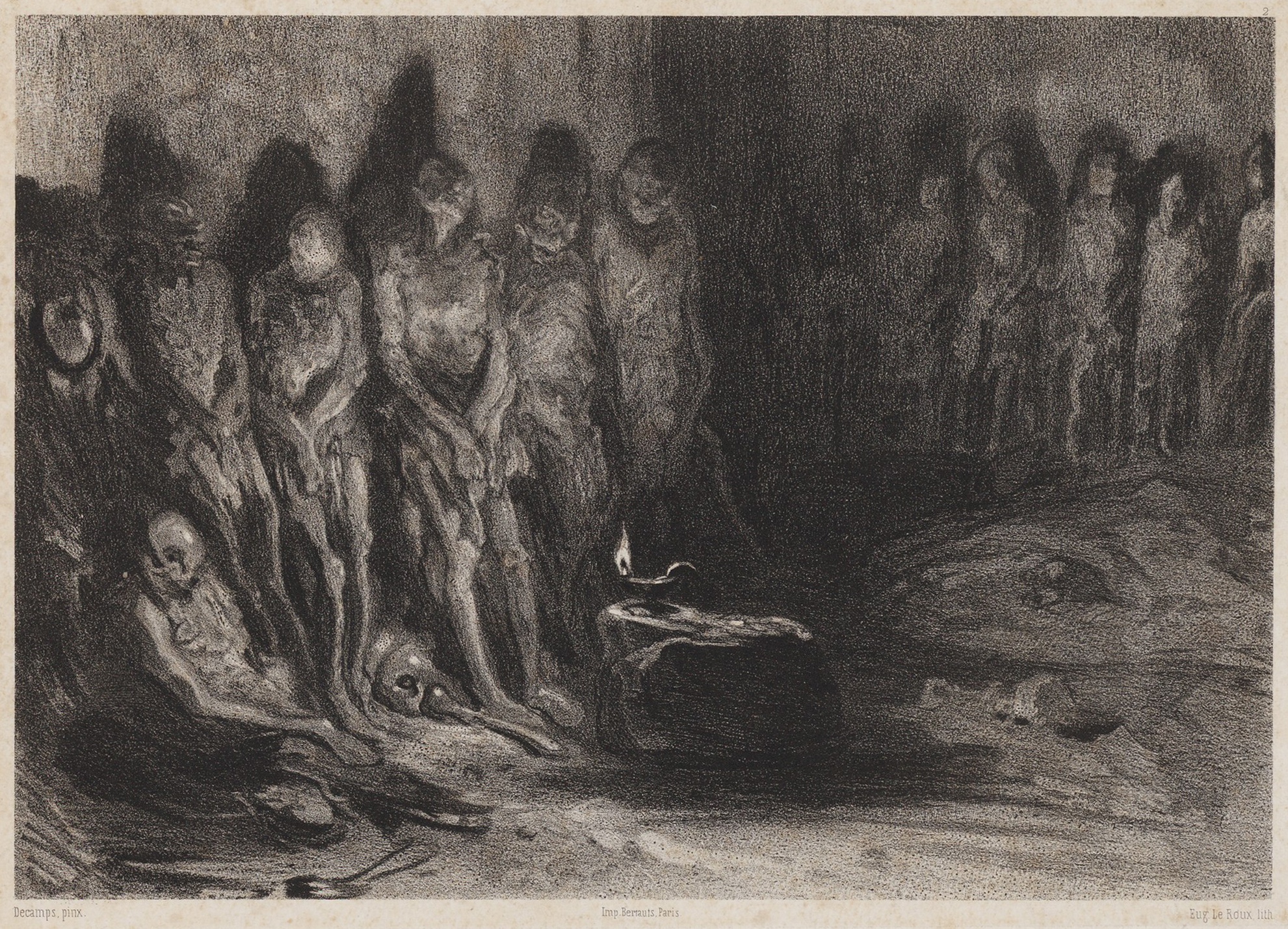 (Lucie Delarue-Mardrus, in Candide, grand hebdomadaire parisien et littéraire, première année, n° 10, jeudi 22 mai 1924 ; « Les Momies de Saint-Michel, » lithographie d’Eugène Leroux, d’après Alexandre-Gabriel Decamps, 1845)