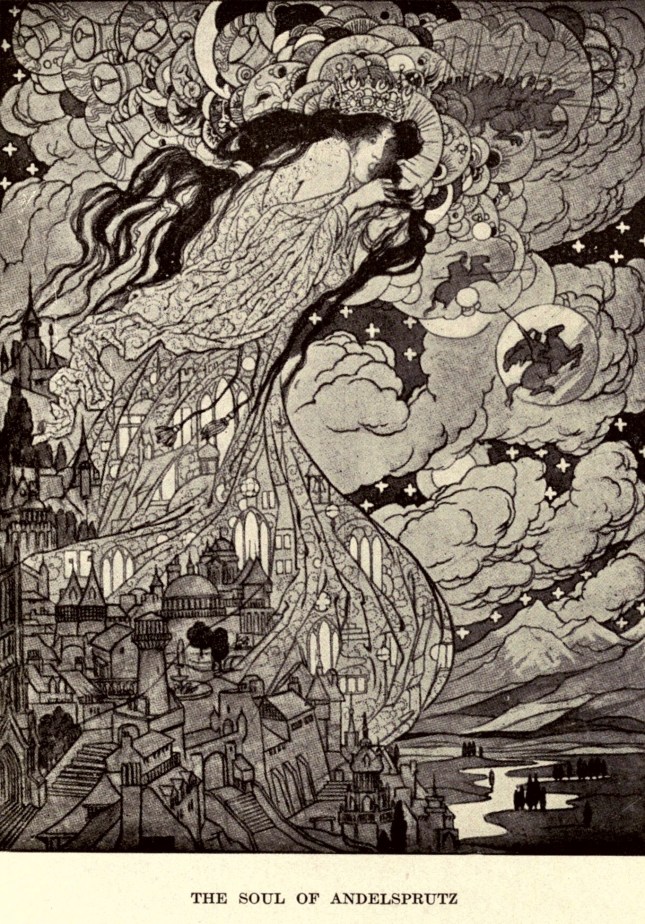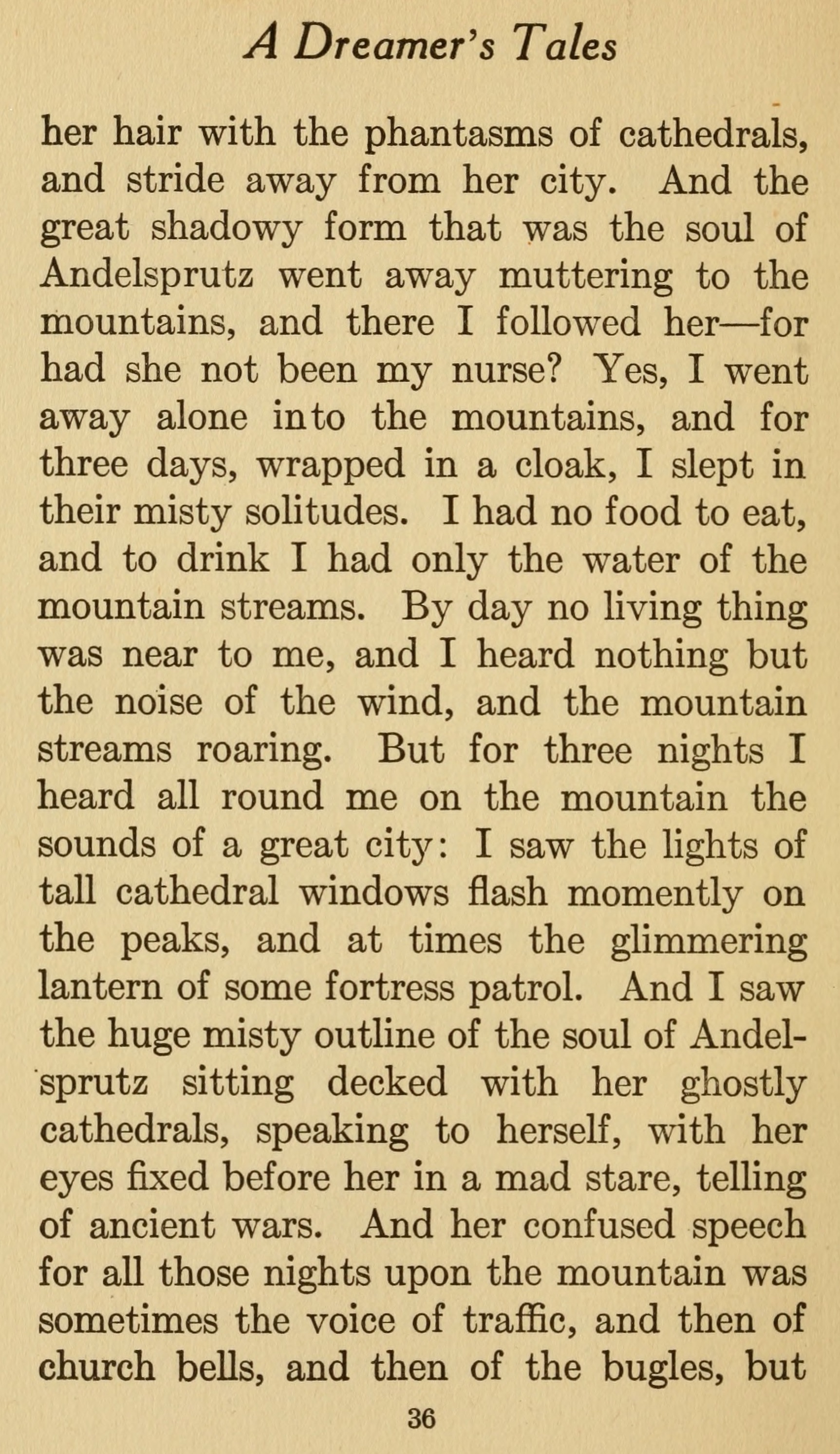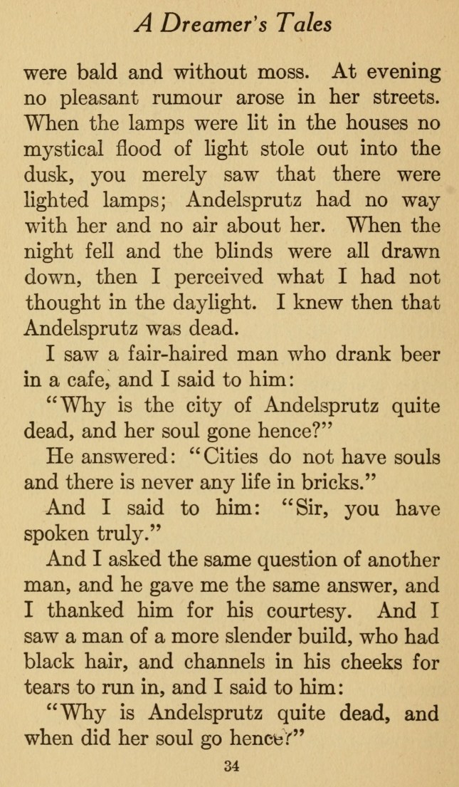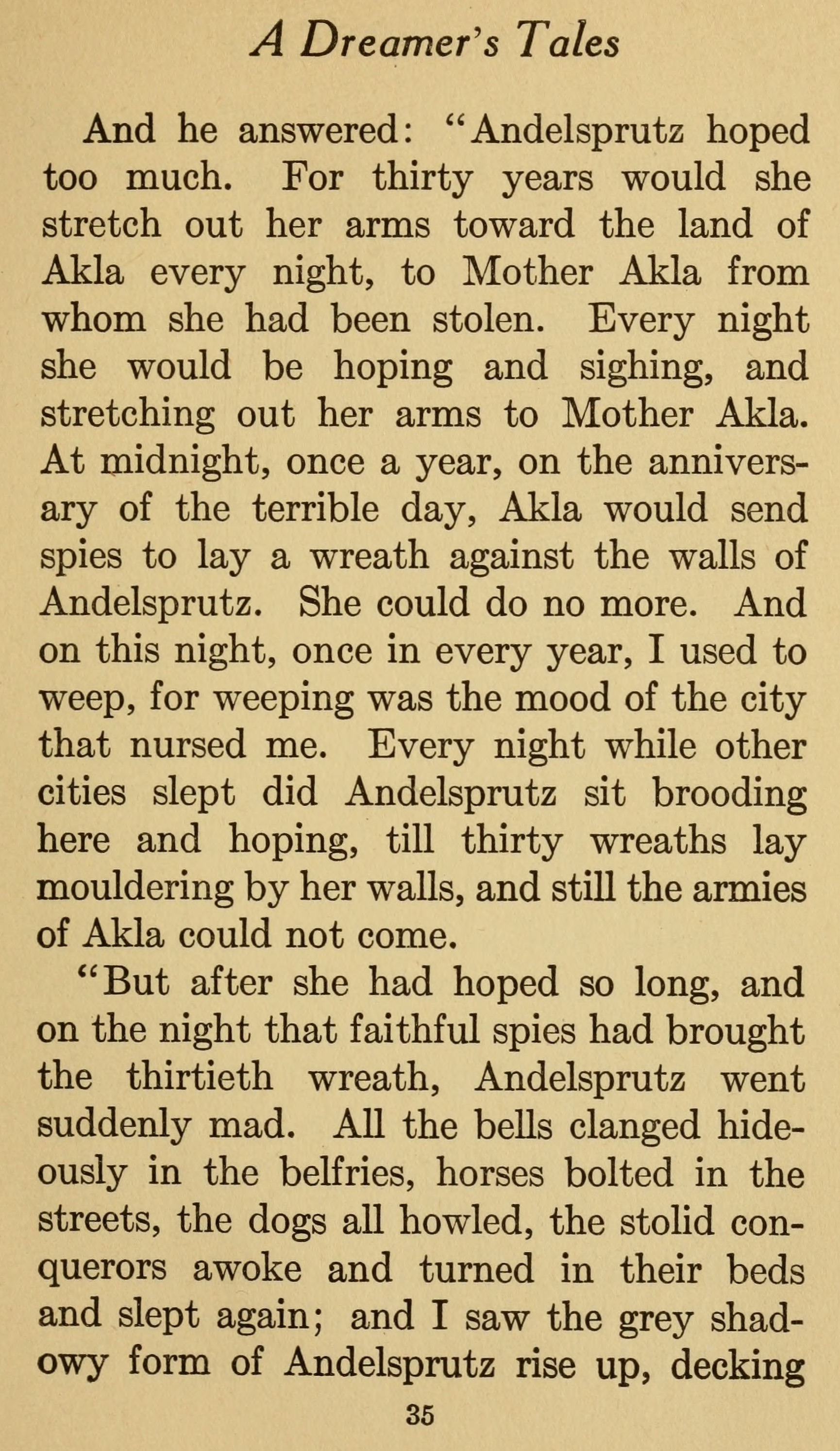 « Andelsprutz espéra trop. Pendant trente années étendit-elle ses bras vers le pays d’Akla, tous les soirs, appelant Mère Akla à laquelle elle avait été volée. Tous les soirs, elle espérait et soupirait et étendait ses bras vers Mère Akla. À minuit, une fois par an, à l’anniversaire du jour terrible, Akla envoyait des espions poser une couronne contre les murs d’Andelsprutz. Elle ne pouvait faire davantage. Et cette nuit-là, une fois par an, j’en pleurais, car pleurer était l’humeur de la cité qui m’éleva. Tous les soirs, tandis que dormaient les autres villes, Andelsprutz restait assise, songeant et espérant, jusqu’à ce qu’il y eût trente couronnes à pourrir contre ses murs et les armées d’Alka ne venaient toujours pas.