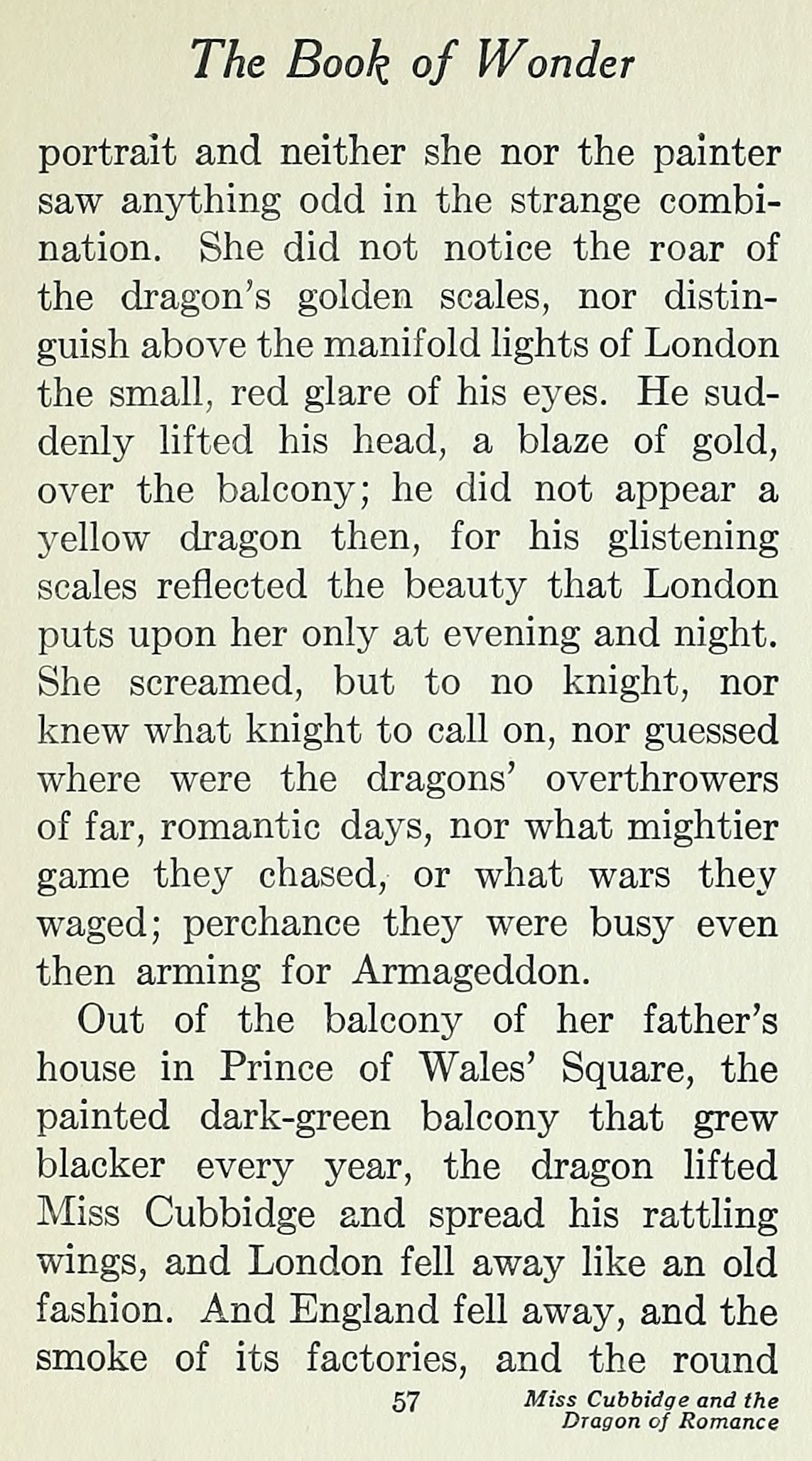 Le soir, Miss Cubbidge s’asseyait solitaire sur son balcon, attendant que son père fût créé baronnet. Elle portait des souliers de marche, un chapeau et une robe décolletée, car elle venait justement de poser pour son portrait et ni le peintre ni elle n’avaient rien vu d’extraordinaire à cette étrange combinaison. Elle n’entendit pas le bruit des écailles d’or du Dragon et ne remarqua nullement parmi les innombrables lumières de Londres la petite lueur rouge de ses yeux. Tout à coup sa tête s’éleva, resplendissante d’or, au-dessus du balcon ; il n’avait pas du tout l’air d’un dragon jaune à ce moment-là, car ses brillantes écailles reflétaient toute la beauté qui enveloppe Londres le soir et la nuit seulement. Elle cria au secours, mais son appel n’était adressé à aucun chevalier ; elle n’aurait même su quel chevalier appeler ; elle ne se demandait seulement pas où pouvaient bien être les vainqueurs de dragons des anciens jours romanesques ; quel plus puissant gibier ils poursuivaient peut-être, ou quelles guerres ils entreprenaient : peut-être étaient-ils occupés juste en ce moment à préparer le départ pour Armageddon.