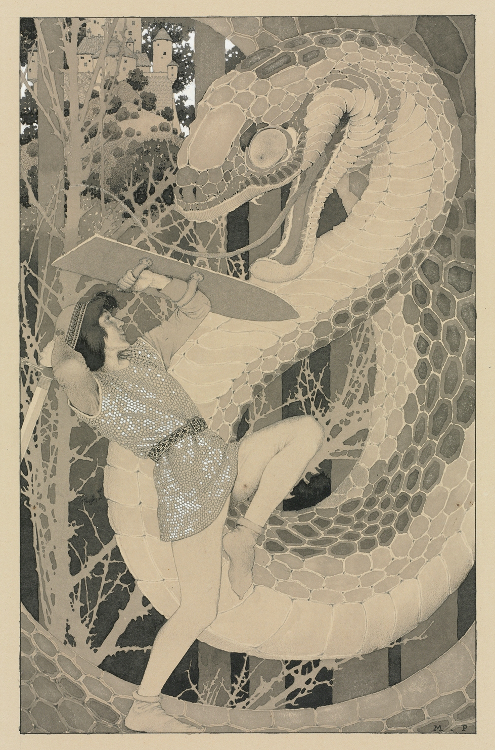 Et si le temps ne passa pas du tout, son unique instant sur ces plages merveilleuses fut pareil à un seul cristal reflétant des milliers d’images. Si ce fut un rêve, ce rêve ne connut ni aurore, ni déclin. La marée mugissait et parlait tout bas de mythes et de mystères, tandis qu’auprès de cette dame captive, le Dragon d’or rêvait, endormi dans son bassin de marbre ; à quelque distance du rivage, tous les songes du dragon se dessinaient faiblement sur le brouillard qui couvrait la mer. Aussi longtemps qu’il rêvait, c’était le crépuscule ; mais quand il s’élançait hors du bassin, la nuit tombait et la lumière des étoiles se reflétait sur ses humides écailles d’or.
