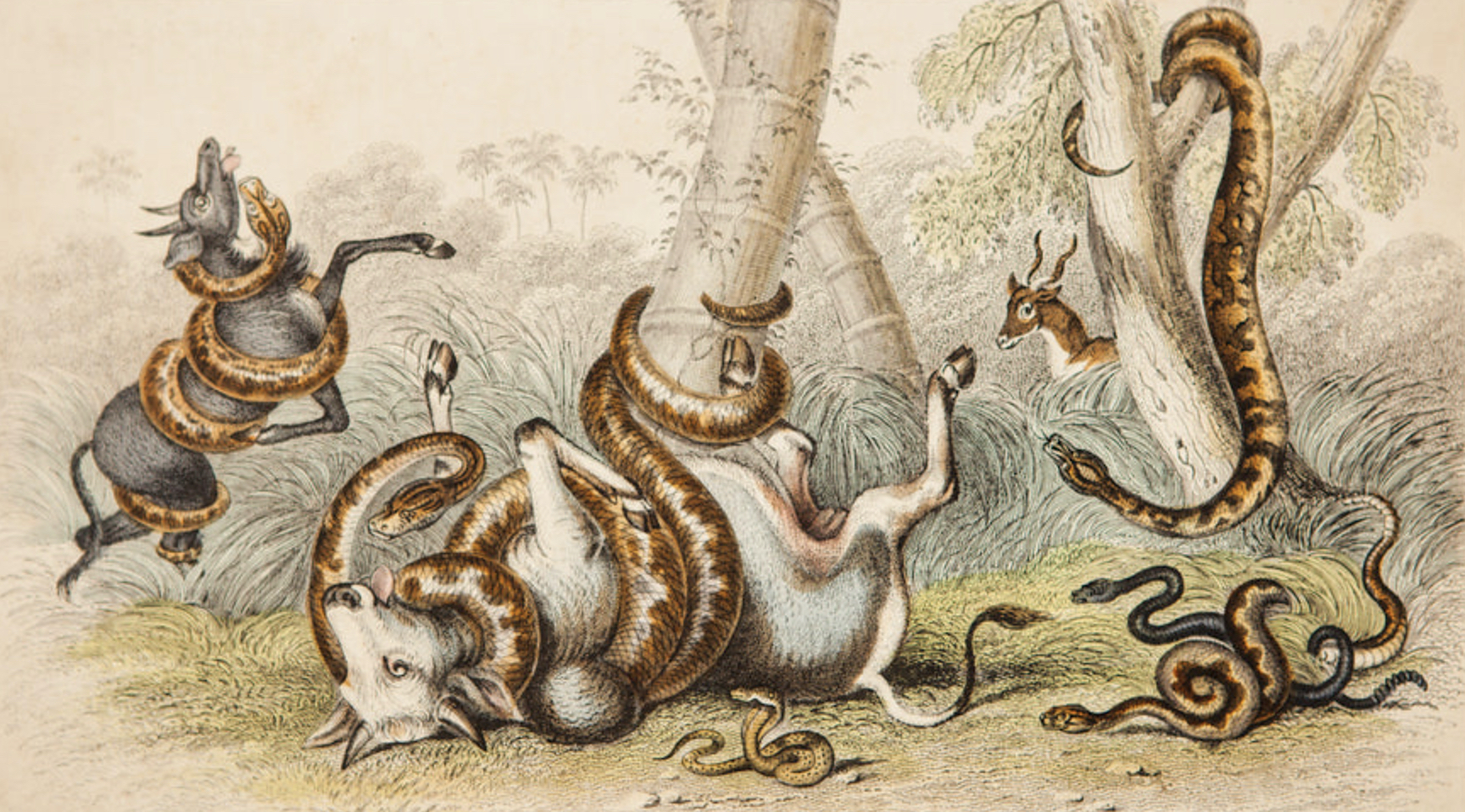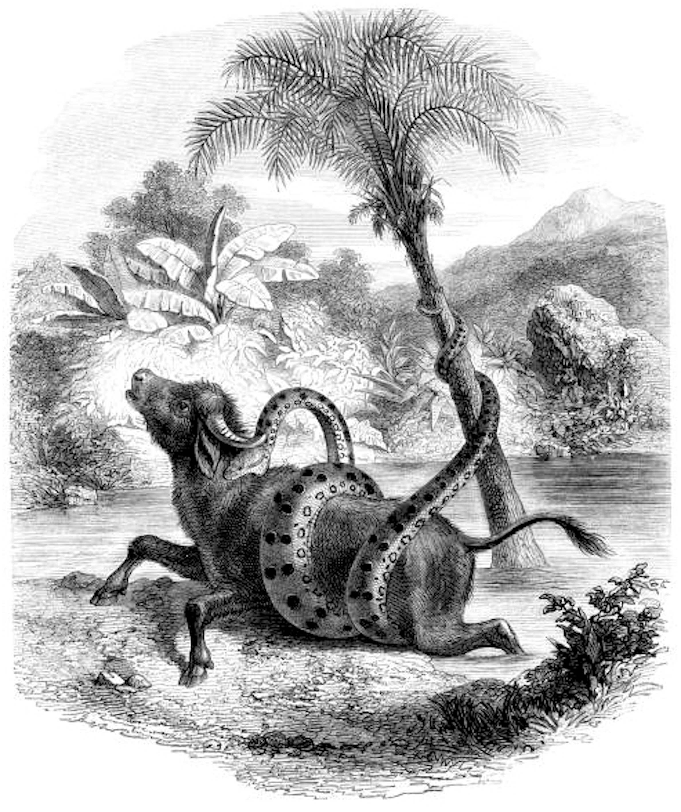 – Et il n’a pas échappé, celui-là ! reprit Mme Verschère. Ah ! ce fut fait en un clin d’œil ! Ce monstre, cet animal abominable le dépasse, l’assomme d’un coup de tête sur la nuque… Le bœuf ne tombe pas, cependant, mais il s’arrête, il vacille sur ses jambes… Et, en un instant, le voilà roulé dans ces affreux anneaux, broyé, pétri… J’ai vu ça, oui, j’ai vu ça, et je le vois encore, même les yeux ouverts, en vous regardant. Après ça, le boa s’est allongé, tout à plat, et il s’est mis à engloutir, engloutir…