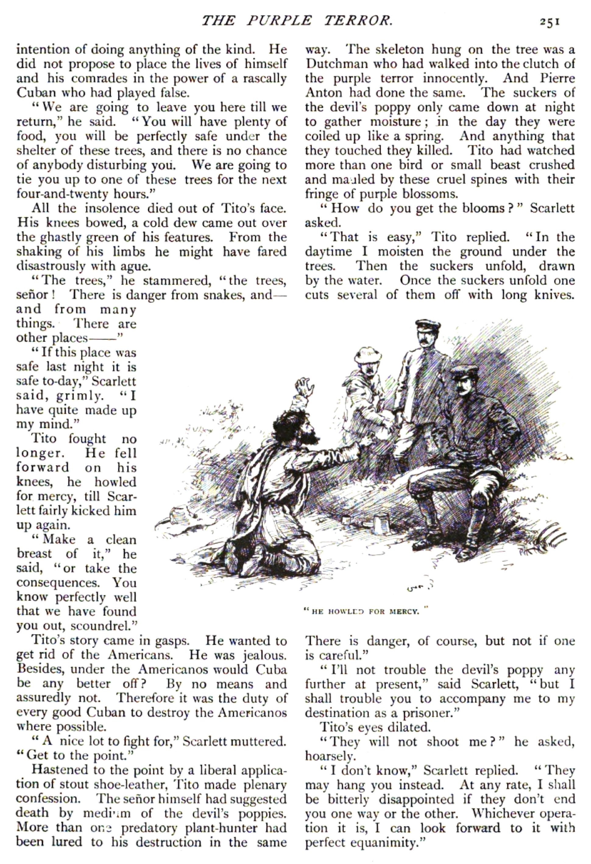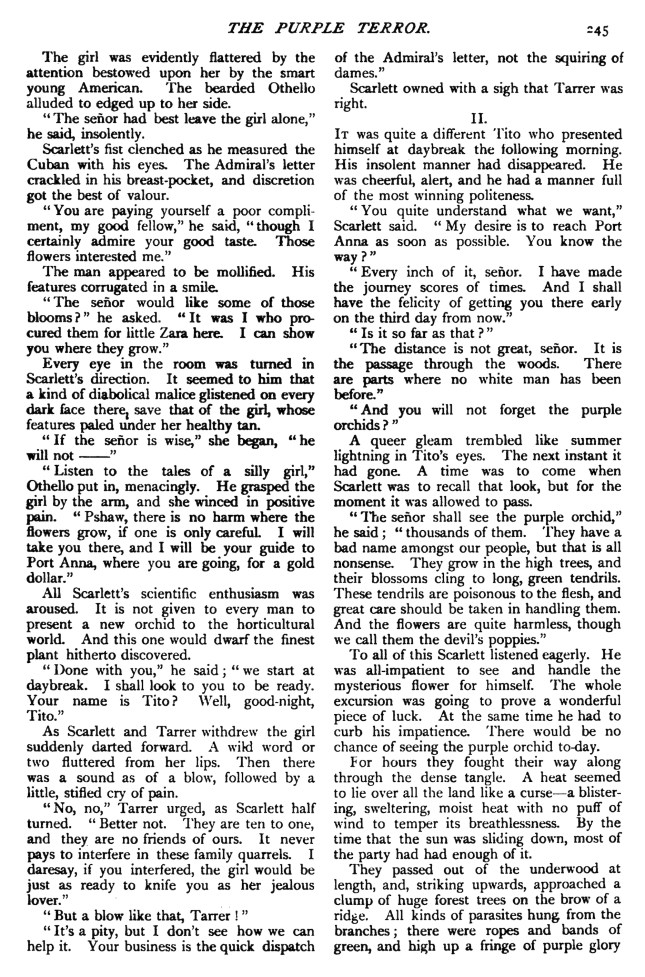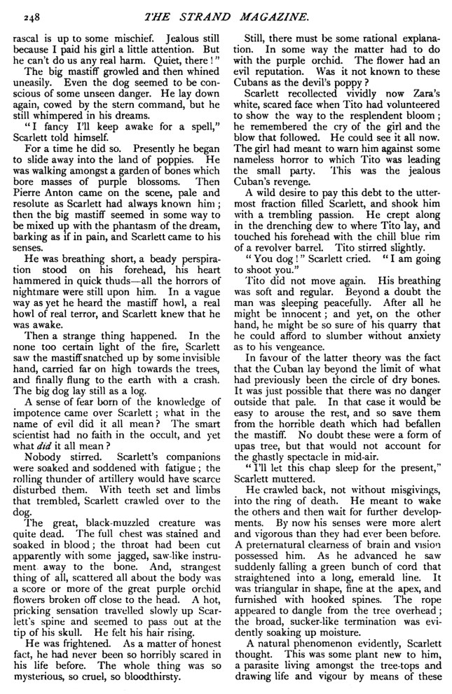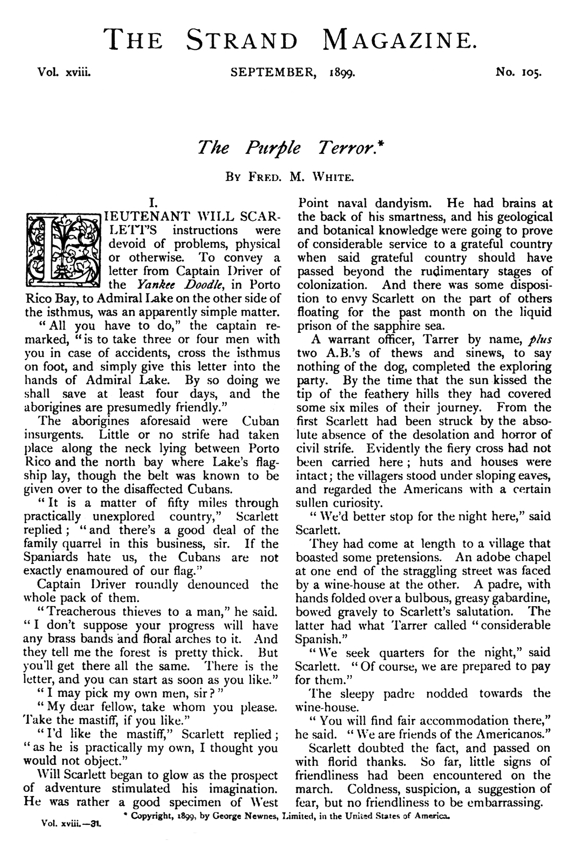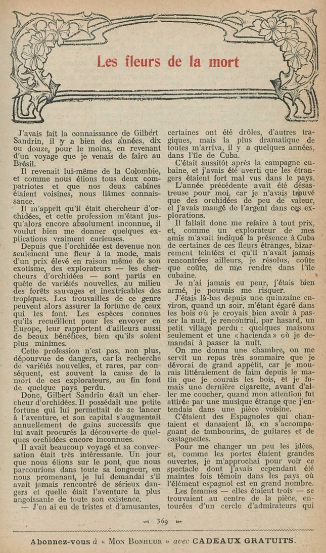 ☞ « Les Fleurs de la mort » constituent un habile démarquage du récit de Fred M. White, « The Purple Terror, » paru dans The Strand Magazine, volume XVIII, n° 105, septembre 1899. Nous aurons l’occasion d’y revenir, Georges Rouvray étant un habitué de ce genre d’emprunts.