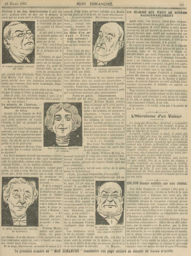 En effet, le bonhomme se tint tranquille et on put commencer à répéter… Les acteurs, qui étaient allés s’habiller et se maquiller dans l’auberge, apparurent dans de somptueux costumes du XVIIIe siècle. Un murmure flatteur s’éleva dans l’assistance, mais, par contre, un roquet s’élança avec des aboiements furieux contre ces chienlits. Pour l’éloigner, il fallut dix minutes et deux ou trois côtelettes fraîches !