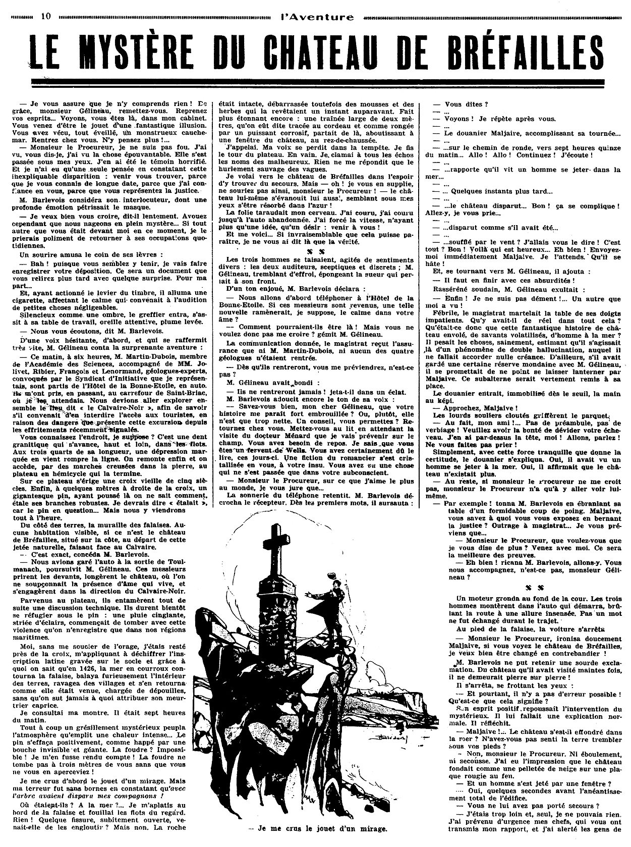 – Nous avions garé l’auto à la sortie de Toulmanach, poursuivit M. Gélineau. Ces messieurs prirent les devants, longèrent le château, où l’on ne soupçonnait la présence d’âme qui vive, et s’engagèrent dans la direction du Calvaire-Noir.