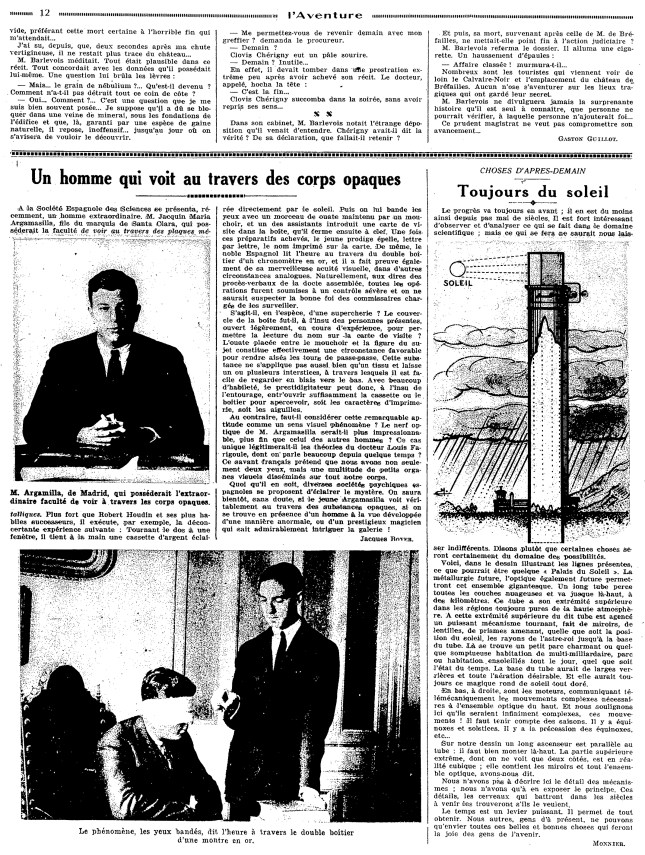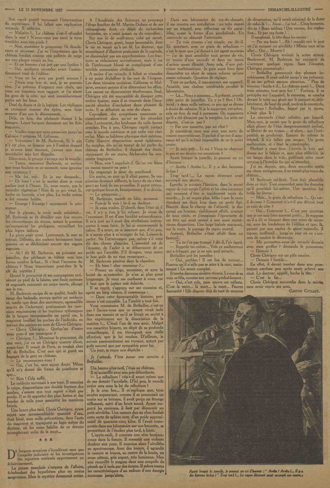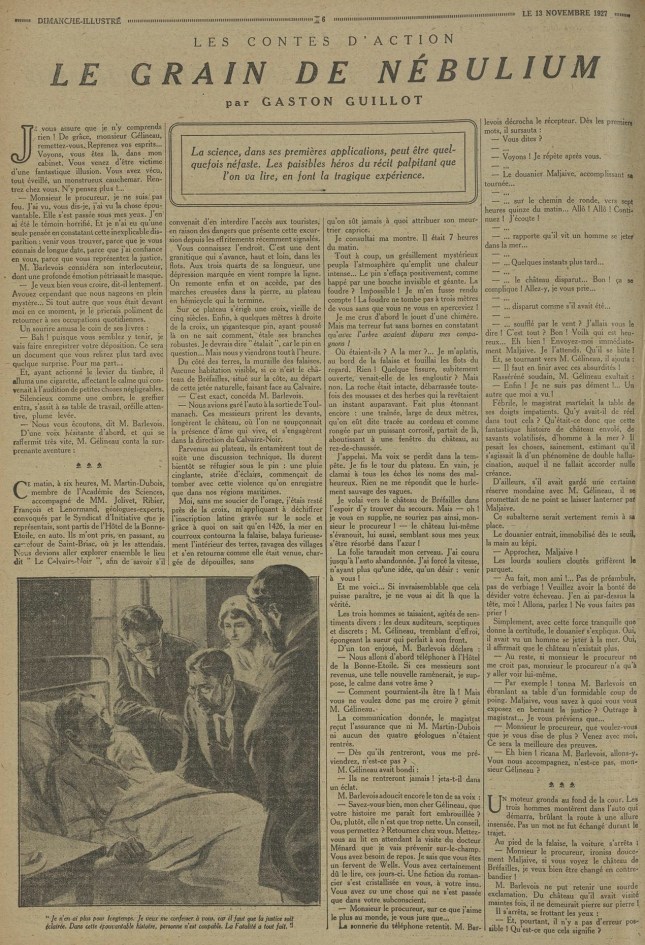 (Gaston Guillot, illustré par Félix Pol Jobbé-Duval, in L’Aventure, n° 12, jeudi 8 septembre 1927 ; repris sous le titre : « Le Grain de nébulium » et amputé de la conclusion, « Les Contes d’action, » dans le Dimanche-Illustré, cinquième année, n° 246, dimanche 13 novembre 1927 ; puis, sous le titre : « Le Château de Bréfailles, » in Le Petit Journal illustré, quarante-deuxième année, n° 2110, 31 mai 1931. La nouvelle a été reprise dans le Bulletin des Amateurs d’Anticipation Ancienne et de Littérature Fantastique, n° 30, décembre 2002 ; elle a été traduite en roumain sans mention d’auteur, sous le titre : « Grăuntele de nebulium, » dans le supplément de la Realitatea ilustrată [Bucarest], n° 712, 10 septembre 1940, qui reprend la version tronquée du Dimanche-Illustré)
