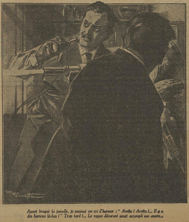 Éperdu, je scrutais l’horizon, dans le secret espoir de voir surgir l’arbre et les cinq inconnus qui venaient d’être si rapidement rayés du monde… Je ne voyais plus, hélas ! que la croix étendant ses deux bras dans un geste figé. Bientôt, dans le champ de l’objectif, je discernai un homme, visiblement affolé, courant de tous côtés, et j’imaginai l’épouvante de cet être qui avait assisté à une aussi mystérieuse disparition. Une large traînée marquait, sur la route, le passage du rayon mortel.