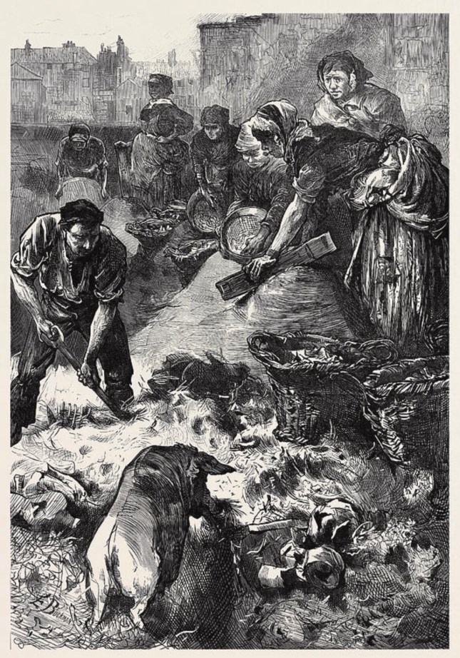 (Barraute du Plessis, Orosia et les treize cochons, Paris : Alphonse Lemerre, 1912 ; « A London Dust-Yard, » gravure d’Edwin Buckman, 1873)