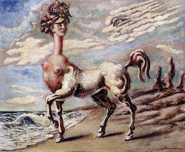 (Maurice Duplay, in Gringoire, le grand hebdomadaire social, politique, littéraire, seizième année, n° 764, 6 août 1943 ; Alberto Savinio, « Mademoiselle Centaure, » tempera sur toile, 1945)