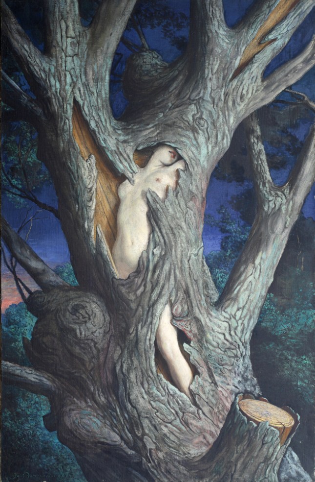(Jules Mouquet, in Le Beffroi, art & littérature modernes, nouvelle série, cinquième année, n° 41, janvier-février 1904 ; Jean-Claude Fourneau, « L’Hamadryade, » huile sur toile, 1948 ; Elizabeth Shippen Green, illustration pour le chapitre « Our Tree-top Library » de An Old Country House de Richard Le Gallienne, 1905)
