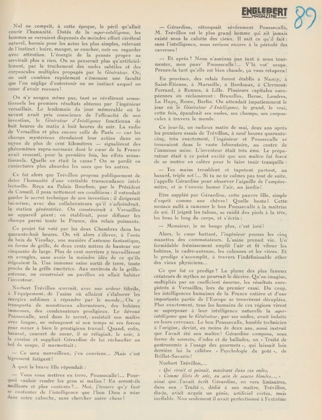 Pour la première fois, le Générateur d’Intelligence fonctionnait dans son ensemble. Qu’allait-il apporter au monde ? Voilà ce que se demandaient, en proie à une angoisse indicible, le génial inventeur et son dévoué Poussecalle.