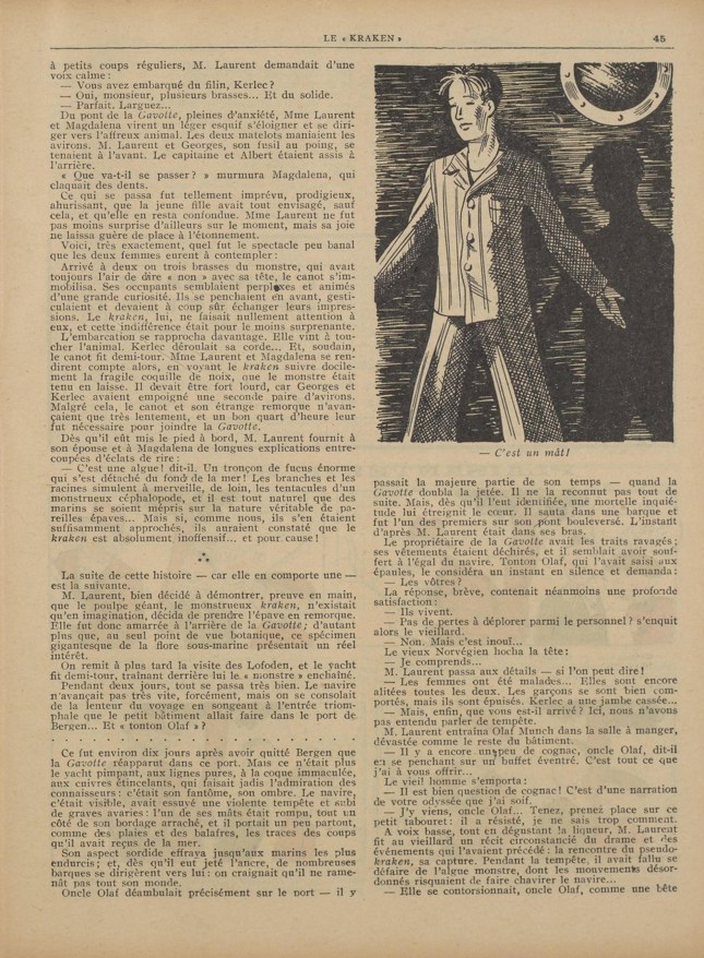 Quand le vieux Olaf Munch eut terminé son récit, personne n’osa prendre la parole. M. Laurent, certes, ne mettait pas en doute sa bonne foi. Mais il se disait que peut-être le « commandant » avait été le jouet d’une illusion d’optique, d’une de ces hallucinations auxquelles les séjours prolongés dans les solitudes de l’océan prédisposent singulièrement. La brume, la naïve terreur de ses compagnons n’avaient-elles pas fait prendre à l’« oncle Olaf » quelque rocher ou quelque épave pour le redoutable kraken ?