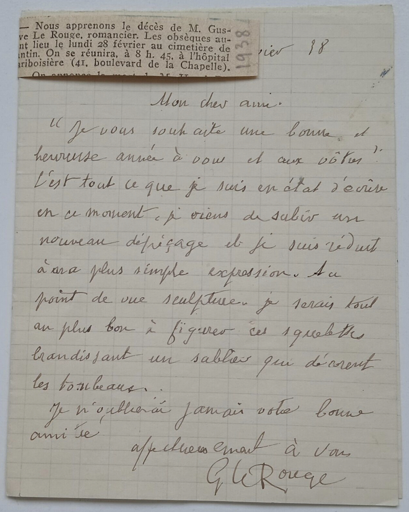 – Nous apprenons le décès de M. Gustave Le Rouge, romancier. Les obsèques auront lieu le lundi 28 février au cimetière de Pantin. On se réunira, à 8 h. 45, à l’hôpital Lariboisière (41, boulevard de la Chapelle).
